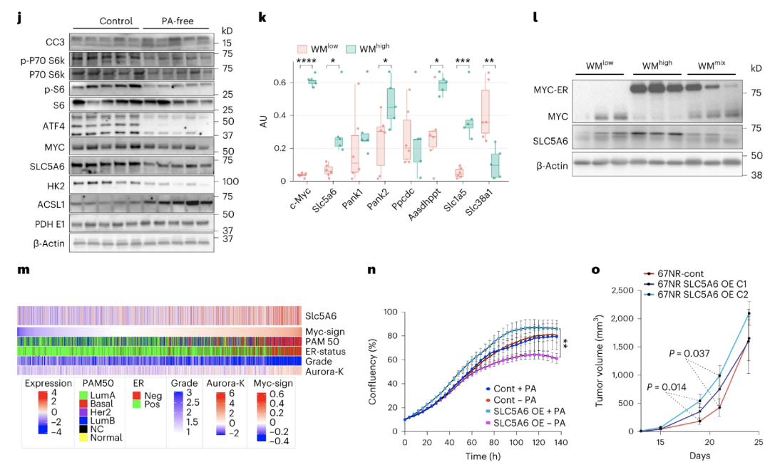 简单来说,MYC可以直接与Slc5a6启动子区域的E-box结合,激活SLC5A6的转录调节。而SLC5A6能控制细胞内的PA水平,即当过表达SLC5A6时,PA的水平急剧增加,进而增强肿瘤细胞的代谢和生长潜力。