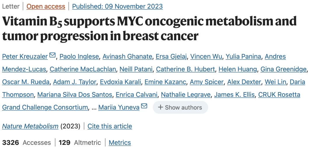 Kreuzaler P, Inglese P, Ghanate A, Gjelaj E, Wu V, Panina Y, Mendez-Lucas A, MacLachlan C, Patani N, Hubert CB, Huang H, Greenidge G, Rueda OM, Taylor AJ, Karali E, Kazanc E, Spicer A, Dexter A, Lin W, Thompson D, Silva Dos Santos M, Calvani E, Legrave N, Ellis JK, Greenwood W, Green M, Nye E, Still E; CRUK Rosetta Grand Challenge Consortium; Barry S, Goodwin RJA, Bruna A, Caldas C, MacRae J, de Carvalho LPS, Poulogiannis G, McMahon G, Takats Z, Bunch J, Yuneva M. Vitamin B5 supports MYC oncogenic metabolism and tumor progression in breast cancer. Nat Metab. 2023 Nov 9. doi: 10.1038/s42255-023-00915-7. Epub ahead of print. PMID: 37946084.