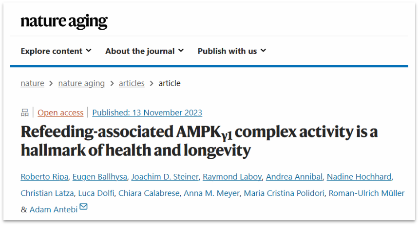 [3] Ripa R, Ballhysa E, Steiner JD, et al. Refeeding-associated AMPKγ1 complex activity is a hallmark of health and longevity. Nat Aging. 2023 Nov 13.
