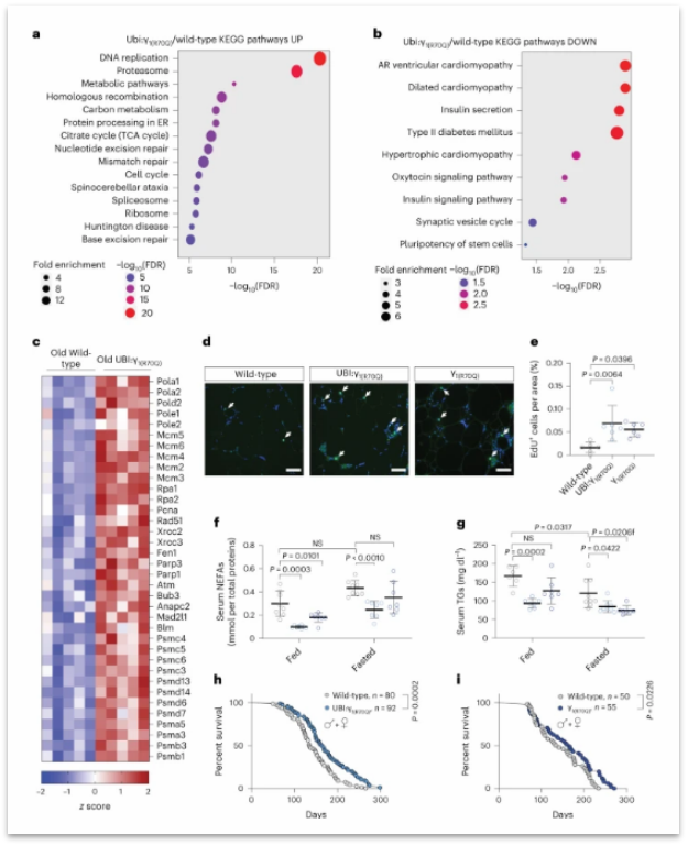 紧接着,研究者生成了过表达γ1 亚基的品系,结果发现,当年老鳉鱼的γ1亚基表达增加时,年老鳉鱼改变了永久性禁食状态,没有出现与年龄相关的 FLTP,并表现出升高的能量代谢水平,更好地维持生命后期组织稳态。总的来说,数据显示,AMPKγ1复合物可刺激组织更新,从而促进健康和长寿。