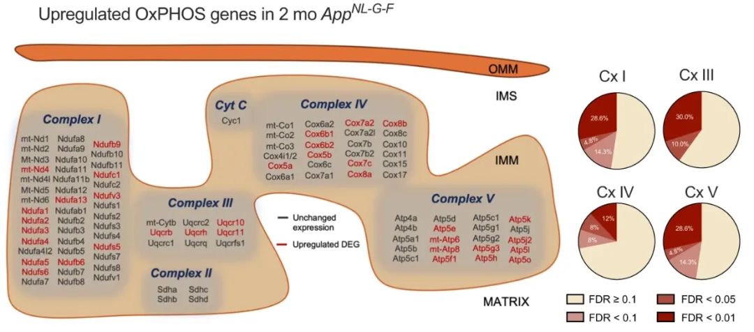 mRNA测序和随后的海马转录通路分析显示,氧化磷酸化(OxPHOS)是模式小鼠早期阶段上调最多的通路之一。这与既往多组学研究中报道的线粒体功能相关共表达基因与Aβ负荷和认知能力下降相关性是一致的。