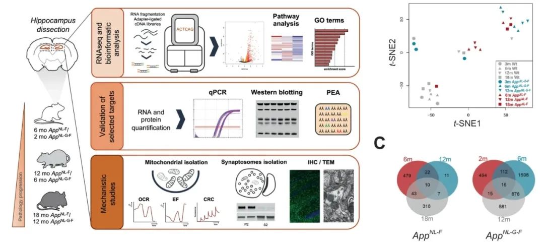 近期,卡罗林斯卡学院科研团队在《分子精神病学》发表论文,研究者分析了两种APP敲入AD模式小鼠疾病进展中的基因表达变化,发现其在病理表现建立之前,表现出显著的高代谢现象,主要表现为氧化磷酸化活性上调。随后出现Aβ病理,以及后续的神经炎症、线粒体功能下降、自噬受损并最终导致突触紊乱。