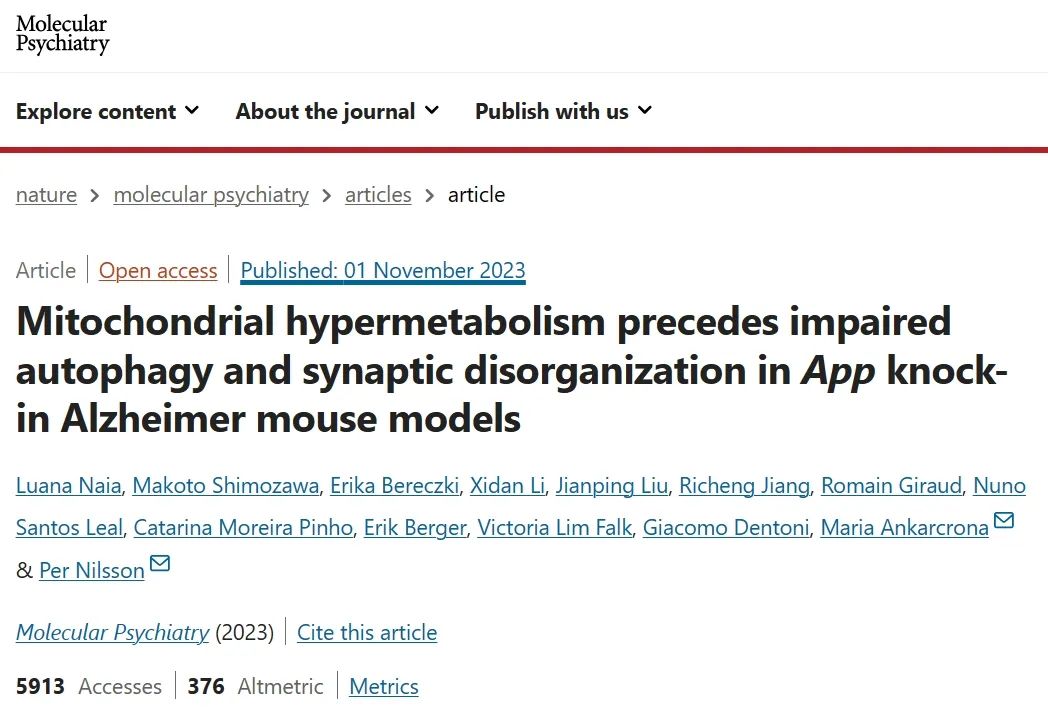 [1]Naia, L., Shimozawa, M., Bereczki, E. et al. Mitochondrial hypermetabolism precedes impaired autophagy and synaptic disorganization in App knock-in Alzheimer mouse models. Mol Psychiatry (2023). https://doi.org/10.1038/s41380-023-02289-4