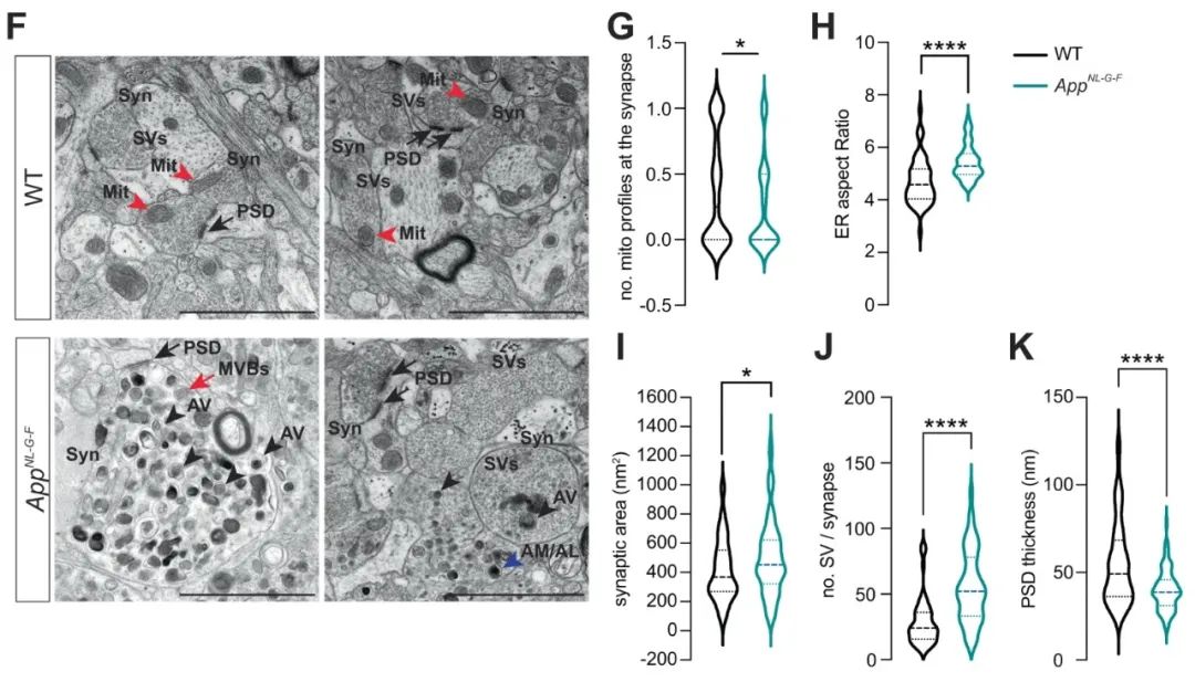 在小鼠疾病的晚期,研究者观察到明显的线粒体功能障碍和突触结构紊乱。在Aβ斑块周围,可见突触前面积和突触囊泡数量明显增加,并可见自噬体的积累。