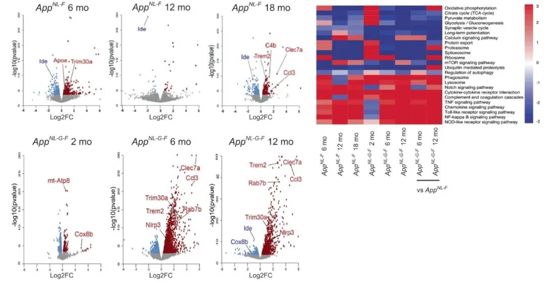 表达差异最显著的基因中,有很多参与神经炎症,例如Trem2、Ccl3、C4b、Nlrp3,以及脂质和能量代谢,例如ApoE、mt-Atp8和Cox8b。其他受影响的途径包括蛋白质稳态和合成、突触囊泡、炎症反应、细胞因子介导的信号转导等等。
