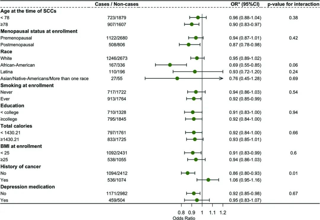 如果将DASH评分视为连续变量,每前进一组,出现≥2种SCC迹象的风险降低7%。分层分析显示,相比白人女性,黑人女性中DASH评分与SCC的关联更强,相比有癌症史的女性,无癌症史的女性中DASH评分与SCC的关联也更强。