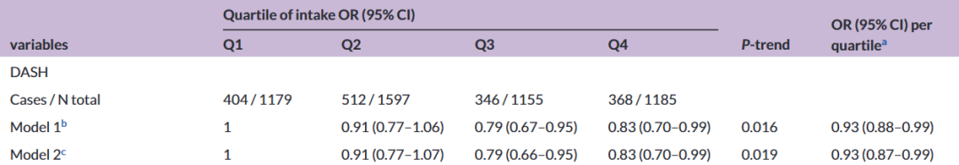 参与者的DASH评分平均为24分(范围10-37分),按照DASH评分将参与者均分为4组,DASH评分,即对DASH饮食的依从性,与SCC之间存在负相关关系。校正年龄、绝经状态、种族、受教育程度、吸烟状况、BMI和总热量摄入这些混杂因素后,与评分最低组相比,最高组出现≥2种SCC迹象的风险降低了17%,在此基础上又校正了癌症史和抑郁症史后,风险的降低没有发生变化。