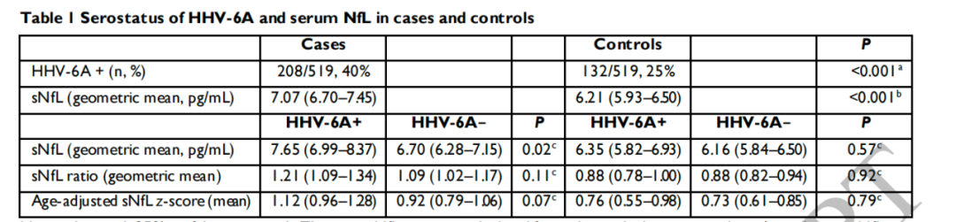 结果发现,与对照组相比,病例组血清HHV-6A阳性样本数量更多。与对照组相比,病例组sNfL水平也明显更高。当进一步按照HHV-6A阳性或者阴性进行划分时,研究人员发现,在病例组中,HHV-6A阳性样本的sNfL水平显著高于HHV-6A阴性样本。