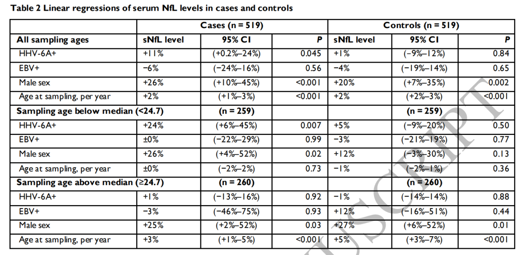 线性回归分析显示,在病例组中,血清HHV-6A阳性与sNfL水平升高11%显著相关。当将年龄限制在中位年龄24.7岁以下时,这一比值将上升至24%。不过,研究人员未在对照组中观察到这一关联。