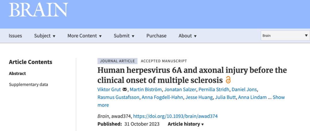 近期瑞典于默奥大学Viktor Grut团队的一项研究发现,血清HHV-6A阳性与MS前驱期代表轴突损伤程度的生物标志物–血清神经丝蛋白轻链(sNfL)水平升高11%显著相关(P=0.045)。