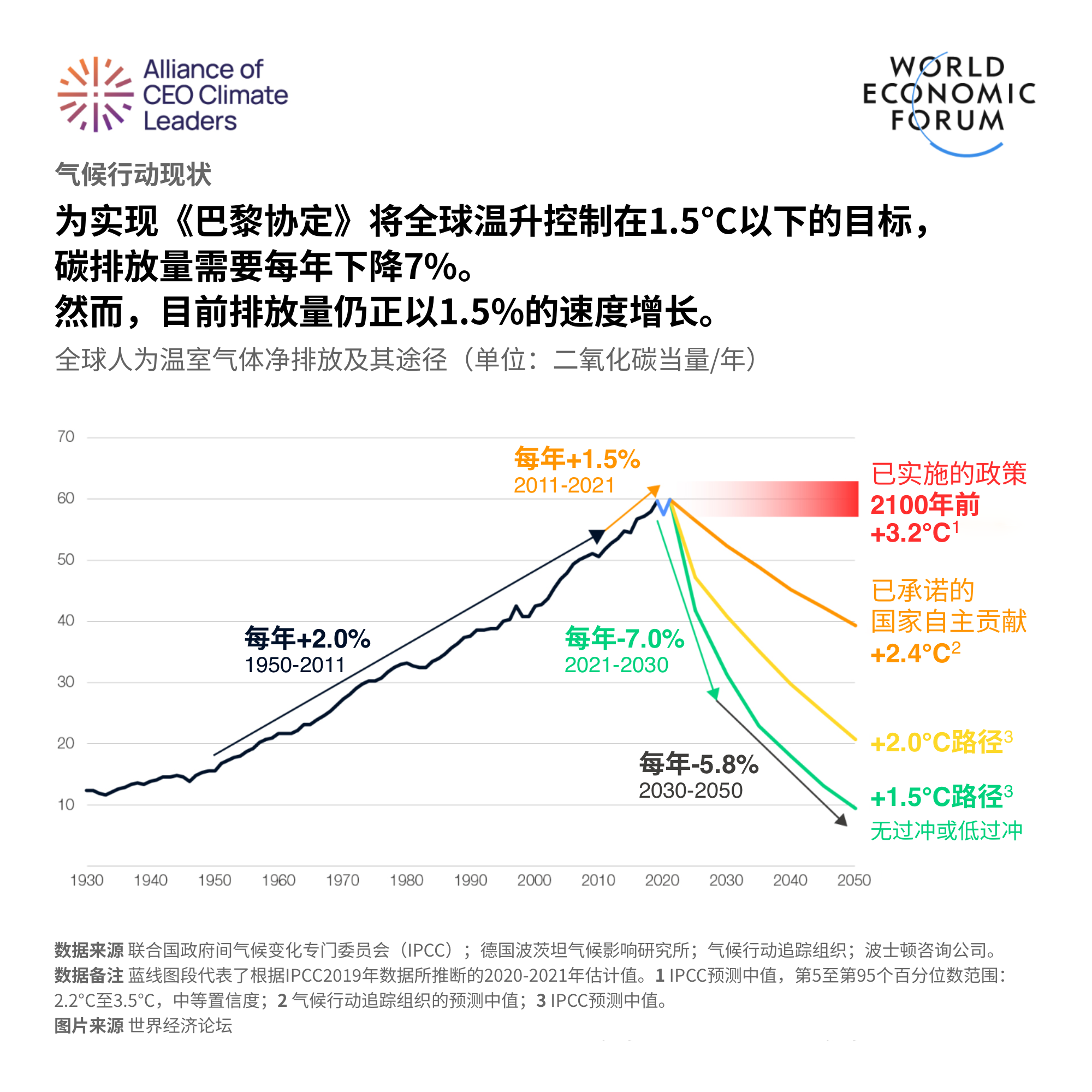 - 目前每年的碳排放量仍在延续增加1.5%的趋势。如果还想在2030年前按期实现《巴黎协定》1.5摄氏度的目标,每年全球的排放量需要减少高达7%。但是这一数字,比受疫情影响异常降低的排放量还要更低。