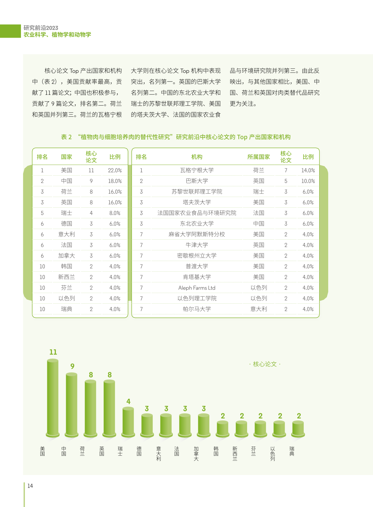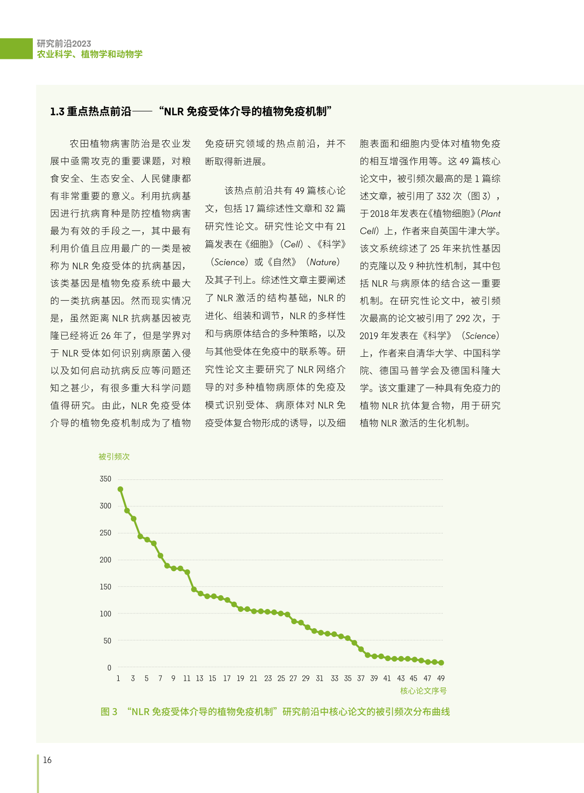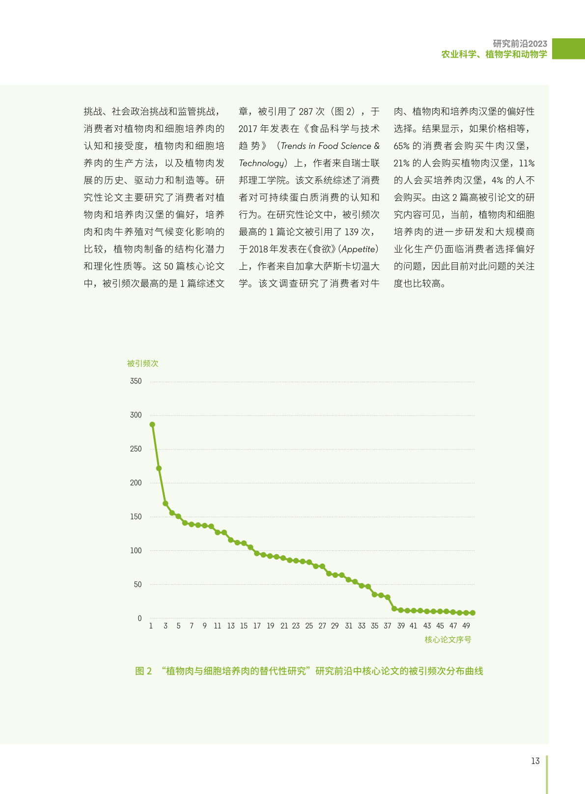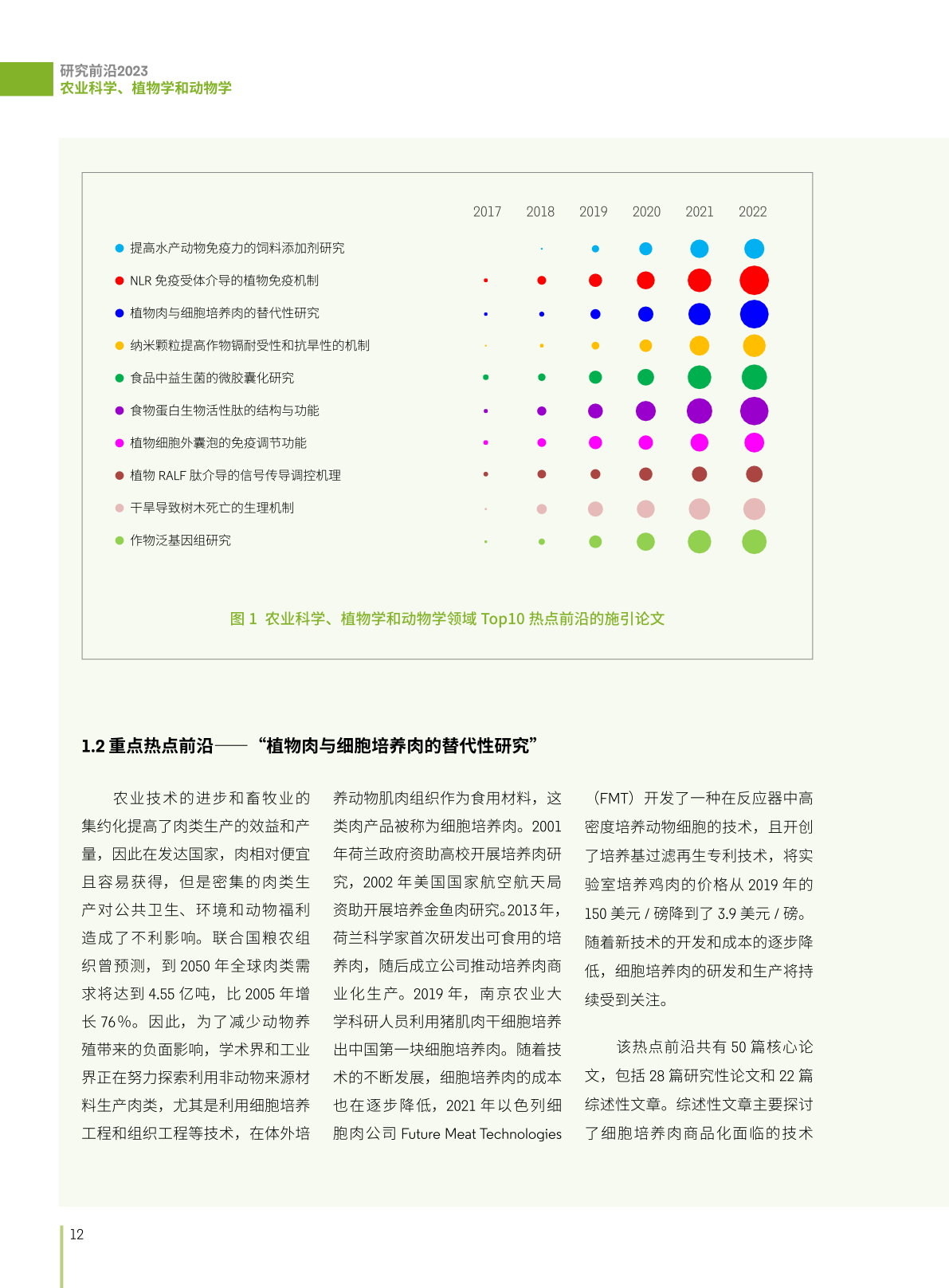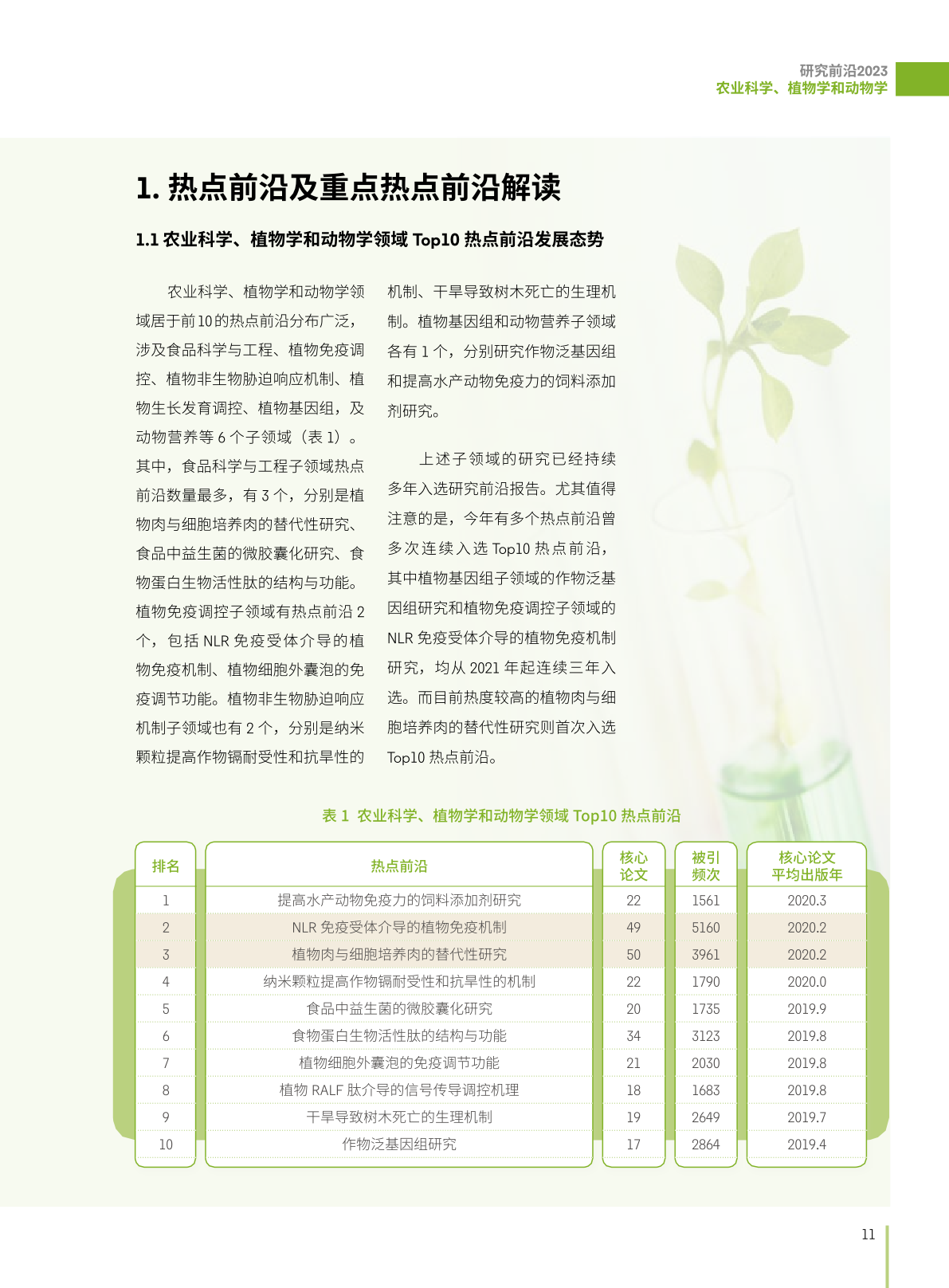 述子领域的研究已经持续 多年入选研究前沿报告。尤其值得 注意的是,今年有多个热点前沿曾 多次连续入选 Top10 热点前沿, 其中植物基因组子领域的作物泛基 因组研究和植物免疫调控子领域的 NLR 免疫受体介导的植物免疫机制 研究,均从 2021 年起连续三年入 选。而目前热度较高的植物肉与细 胞培养肉的替代性研究则首次入选 Top10 热点前沿。