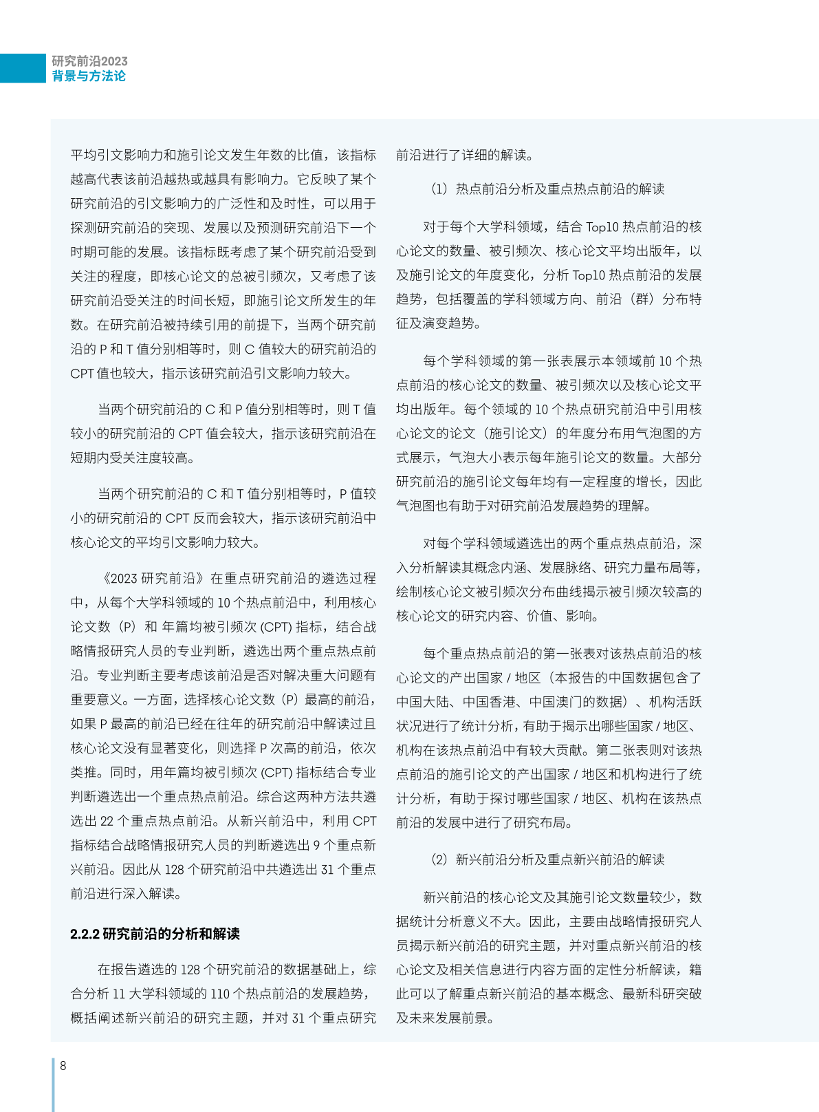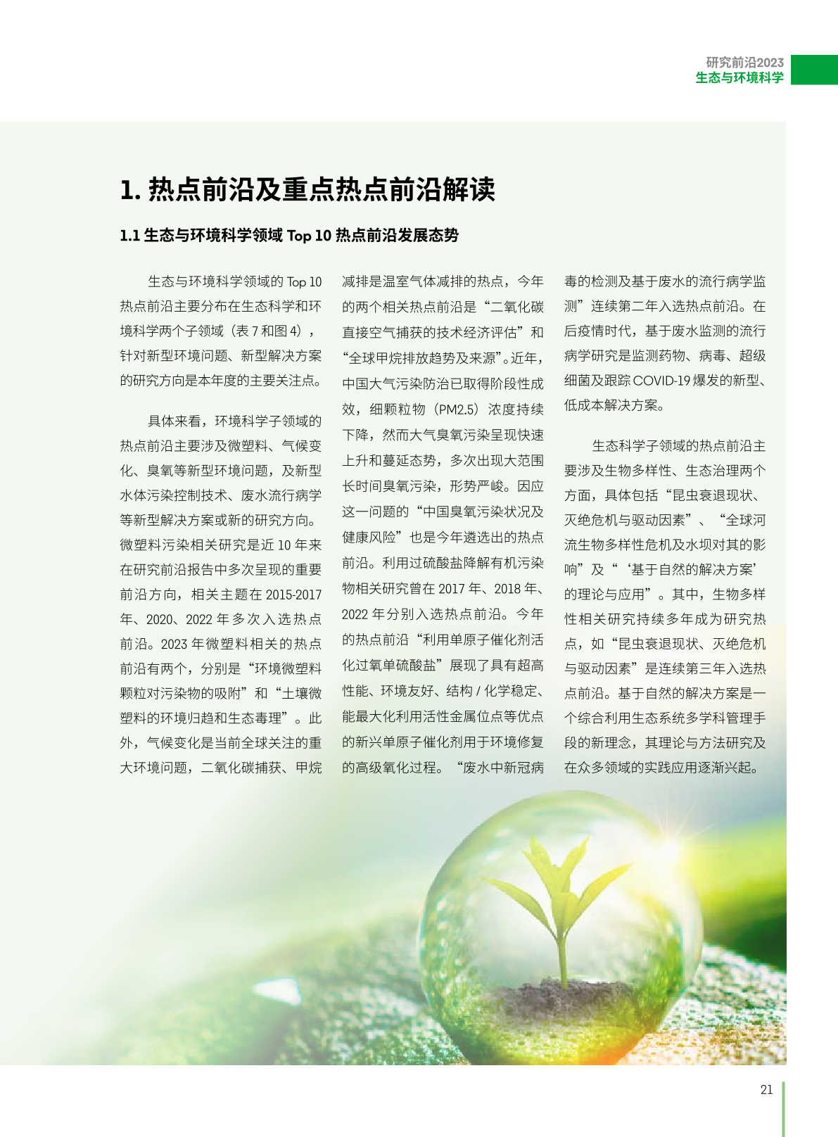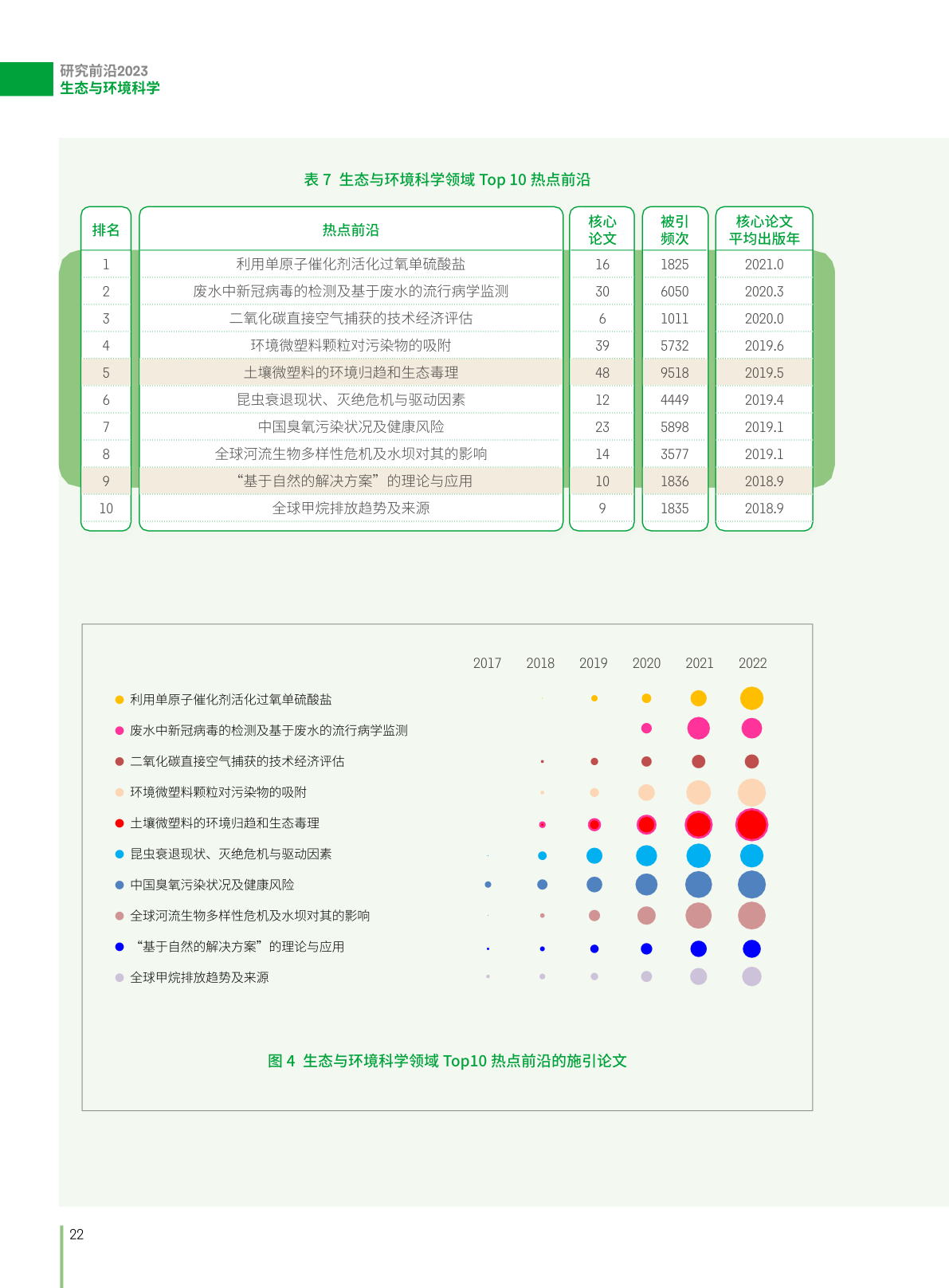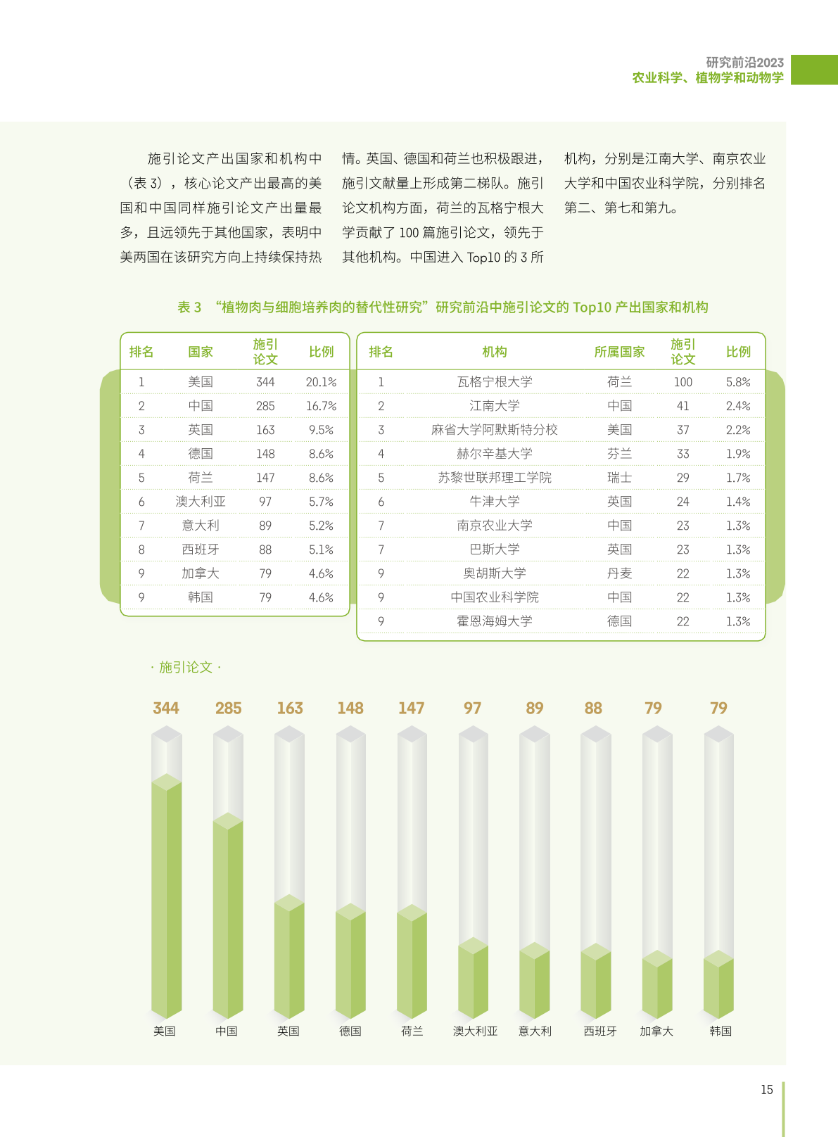 述子领域的研究已经持续 多年入选研究前沿报告。尤其值得 注意的是,今年有多个热点前沿曾 多次连续入选 Top10 热点前沿, 其中植物基因组子领域的作物泛基 因组研究和植物免疫调控子领域的 NLR 免疫受体介导的植物免疫机制 研究,均从 2021 年起连续三年入 选。而目前热度较高的植物肉与细 胞培养肉的替代性研究则首次入选 Top10 热点前沿。