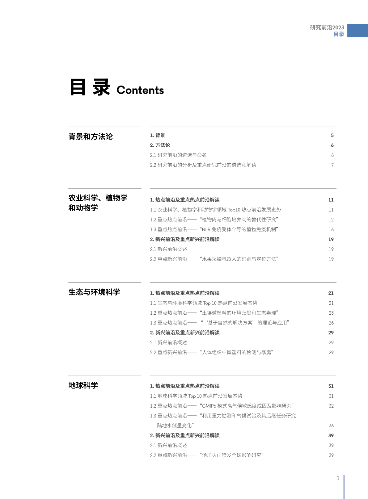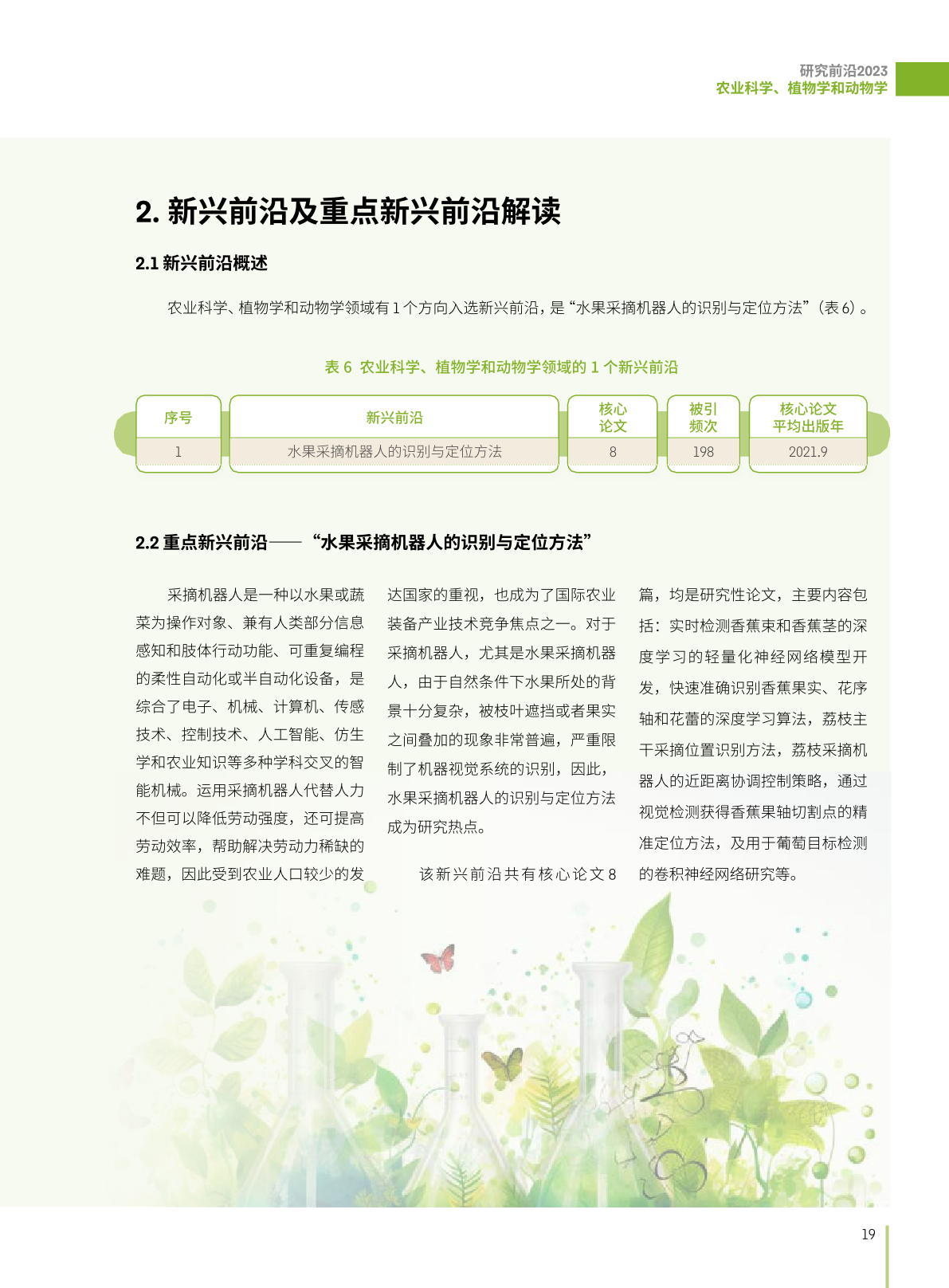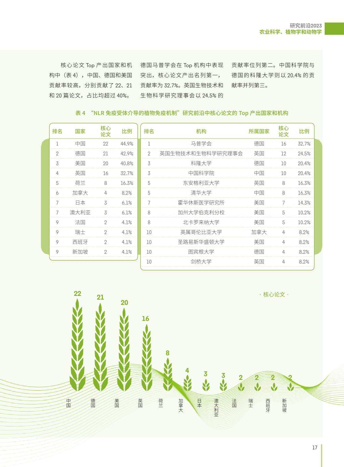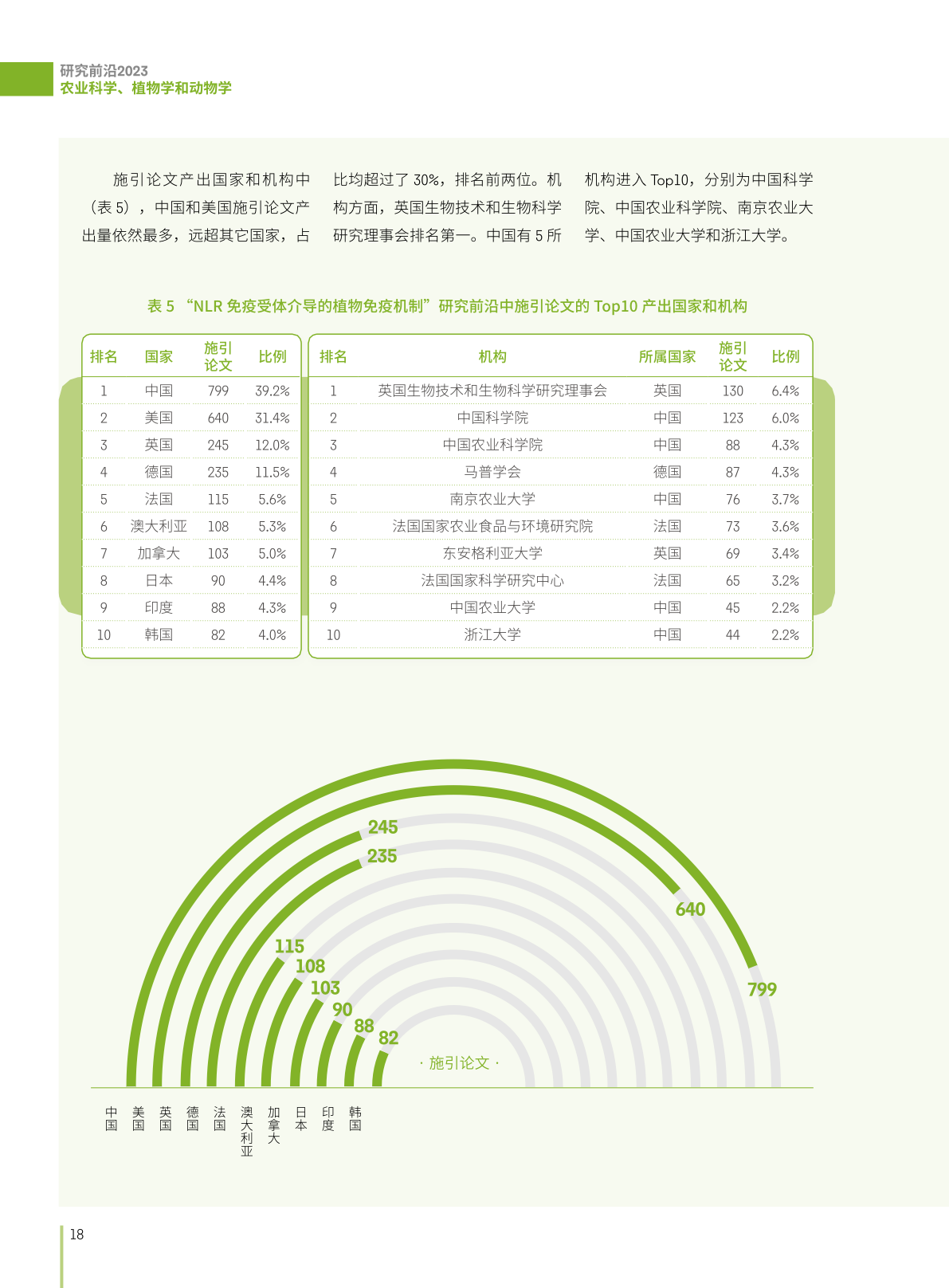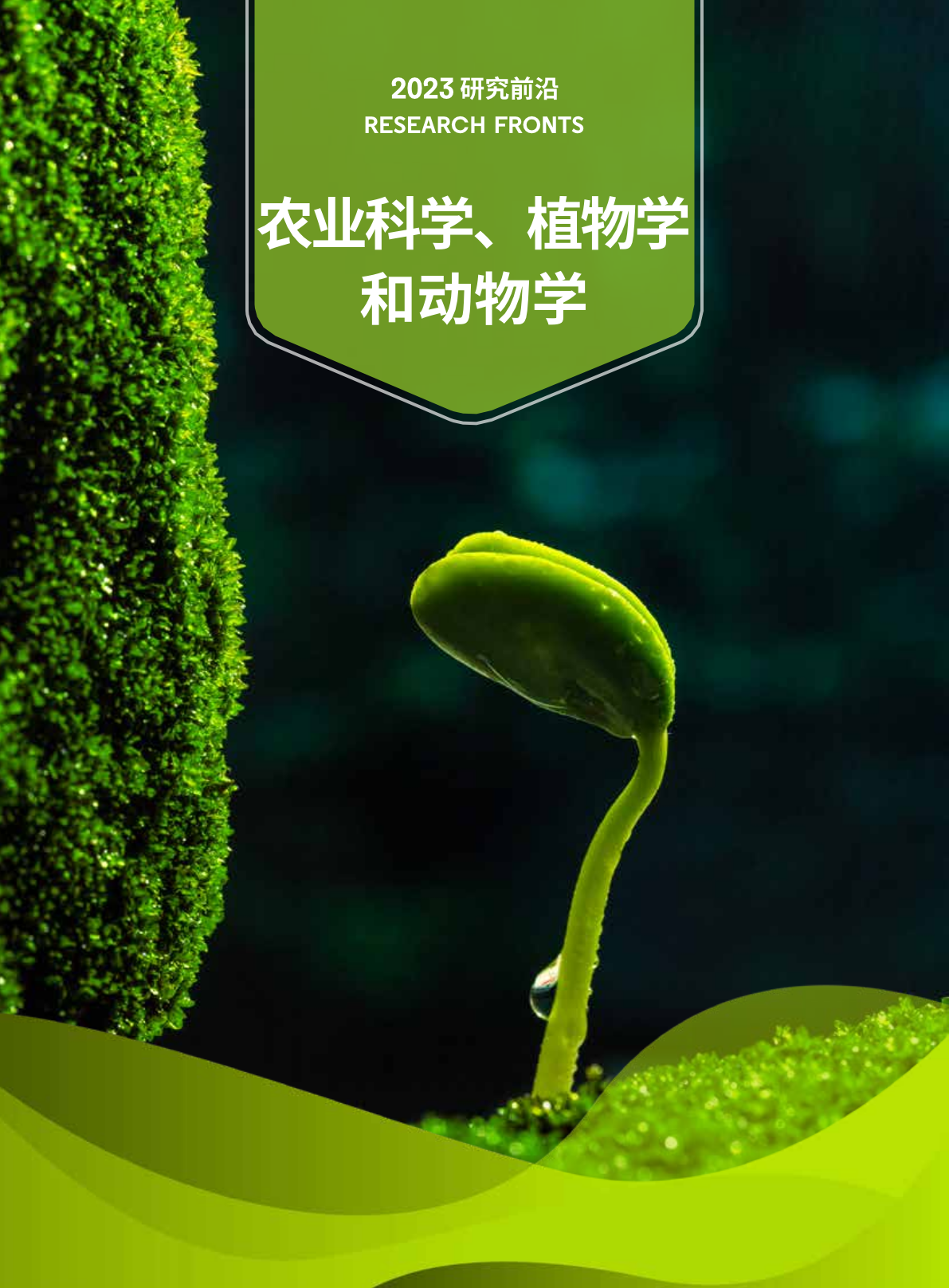 农业科学、植物学和动物学领 域居于前 10 的热点前沿分布广泛, 涉及食品科学与工程、植物免疫调 控、植物非生物胁迫响应机制、植 物生长发育调控、植物基因组,及 动物营养等 6 个子领域。