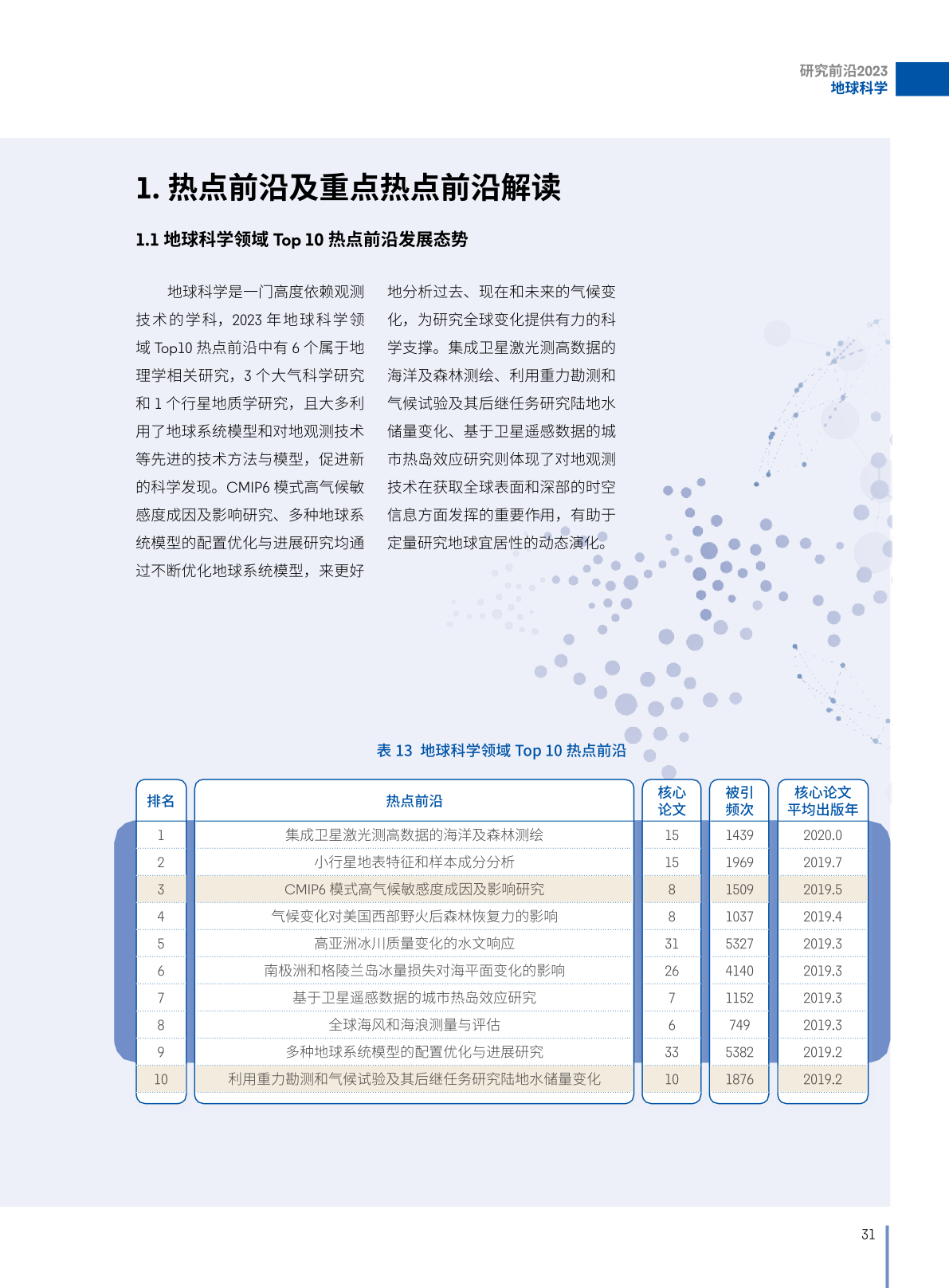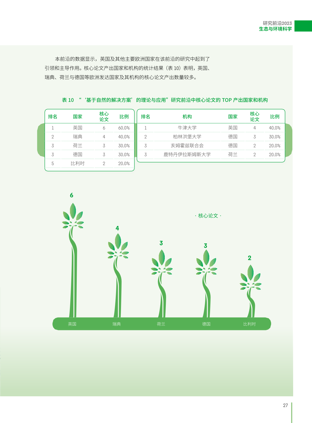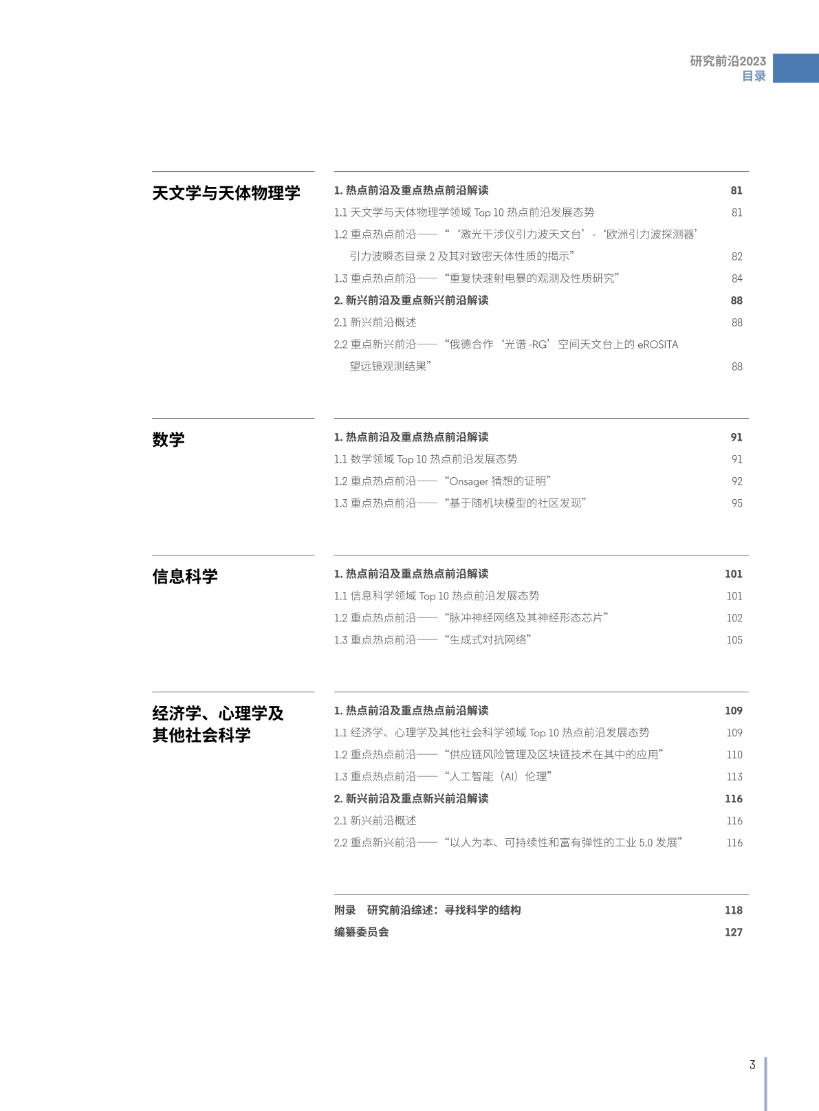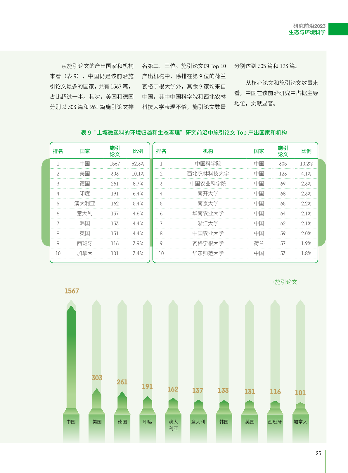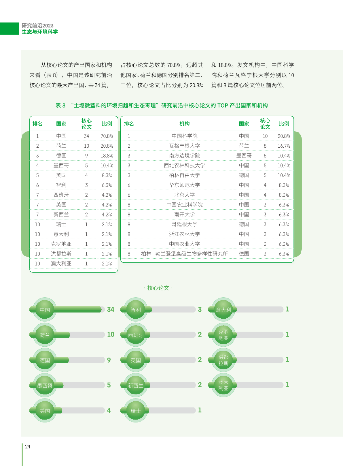 农业科学、植物学和动物学领 域居于前 10 的热点前沿分布广泛, 涉及食品科学与工程、植物免疫调 控、植物非生物胁迫响应机制、植 物生长发育调控、植物基因组,及 动物营养等 6 个子领域。