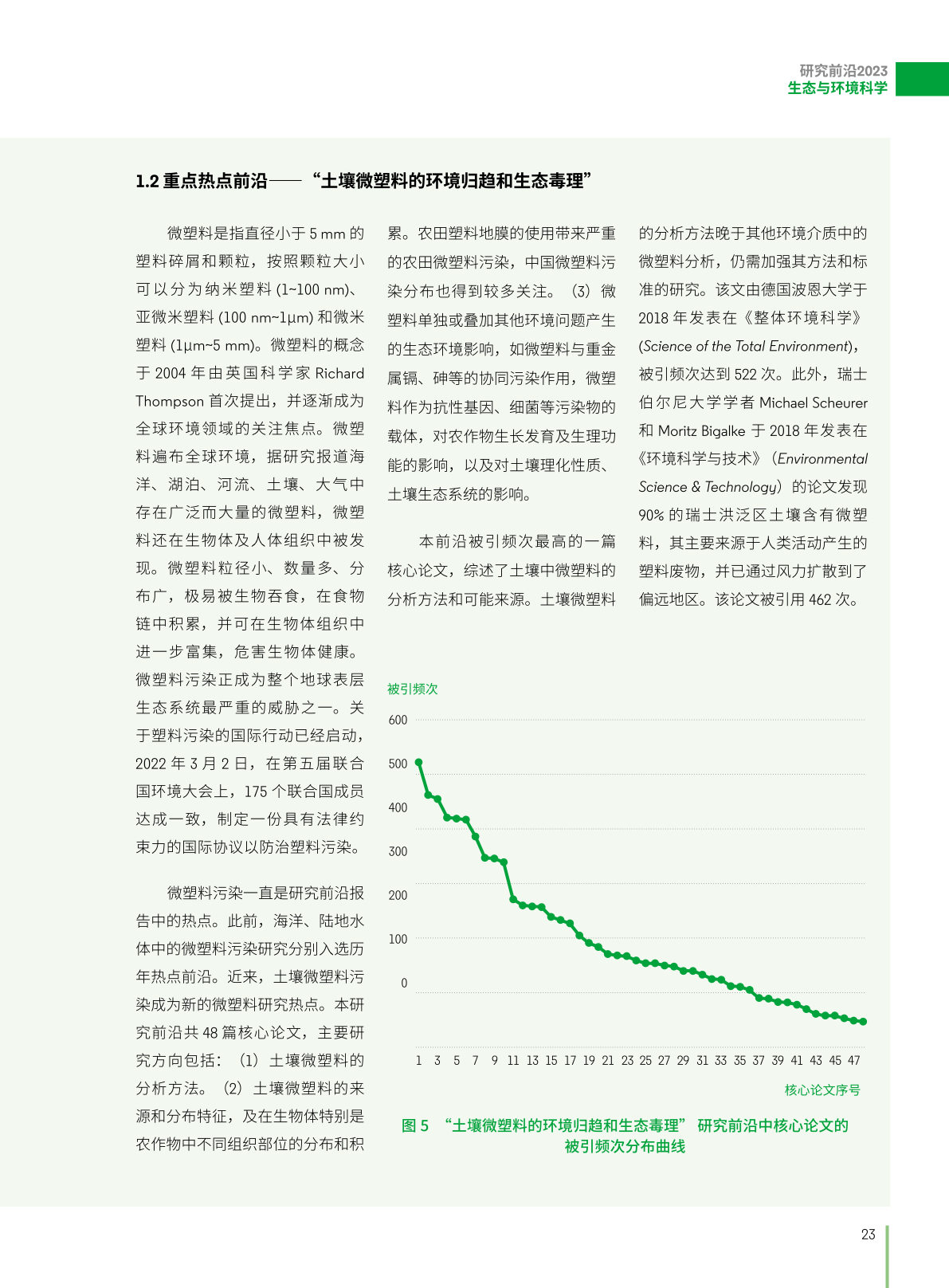 其中,食品科学与工程子领域热点 前沿数量最多,有 3 个,分别是植 物肉与细胞培养肉的替代性研究、 食品中益生菌的微胶囊化研究、食 物蛋白生物活性肽的结构与功能。 植物免疫调控子领域有热点前沿 2 个,包括 NLR 免疫受体介导的植 物免疫机制、植物细胞外囊泡的免 疫调节功能。植物非生物胁迫响应 机制子领域也有 2 个,分别是纳米 颗粒提高作物镉耐受性和抗旱性的机制、干旱导致树木死亡的生理机 制。植物基因组和动物营养子领域 各有 1 个,分别研究作物泛基因组 和提高水产动物免疫力的饲料添加 剂研究。