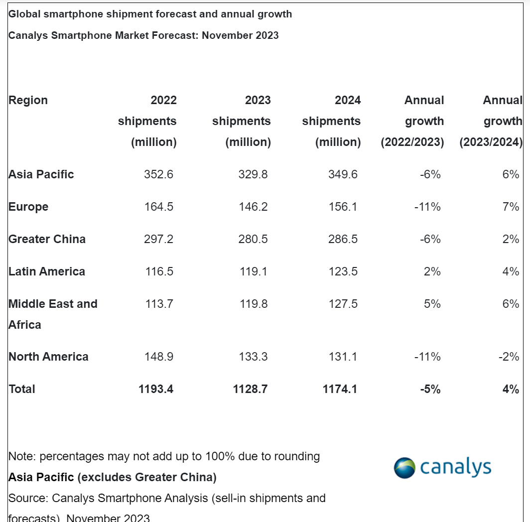 Canalys高级分析师Sanyam Chaurasia表示:“2024年智能手机的反弹将受到新兴市场的推动,在这些市场,智能手机仍然是联网、娱乐和生产力不可或缺的一部分。2024年出货的智能手机中将有1/3来自亚太地区,而2017年这一比例仅为1/5。在印度、东南亚和南亚需求复苏的推动下,该地区也将以6%的年增长率成为增长最快的地区之一。随着这些国家的宏观经济状况和消费者信心的稳定,智能手机的升级将会加速。”