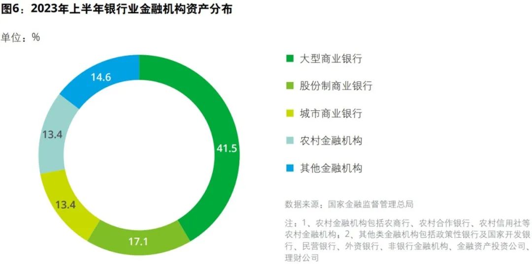 具体来看,大型银行仍处领先地位,资产规模占比41.5%,2023年6月末同比增长13.7%;股份制银行自2021年以来,资产增长趋缓,增速区间为6-8%,2023年6月末同比增长6.8%,且资产占比自2017年末18.0%降至17.1%;与之对应,城市商业银行支持区域实体企业融资,资产增长较快,2023年6月末同比增长11.0%,资产占比自2017年末12.9%增长至13.4%。