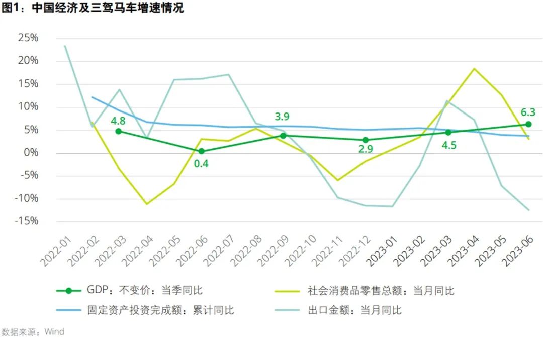 2022年底疫情防控放开后,今年中国经济总体恢复向好,在经历了一季度的强势反弹后,从二季度开始复苏势头逐步回落,2023年6月末GDP累计同比增长5.5%。其中,社会消费品零售总额同比增长8.2%,一方面与去年同期的低基数有关,另一方面,居民预防性储蓄的心态还是较为浓厚,在一、二季度的央行城镇储户的问卷调查中,选择“更多储蓄占比”的储户接近六成;全国固定资产投资截至2023年6月末累计增长3.8%,房地产开发投资下降7.9%,而基础设施和制造业投资表现较好,分别实现7.2%和6.0%的增速,高技术产业投资业增长较快,达到12.5%;此外,受外部需求下降、去年外贸表现强势和人民币贬值的影响,截至2023年6月末出口金额(以美元计)累计收窄3.2%。整体来看,国内需求不足,外部环境复杂严峻,仍是当前经济运行面临的主要挑战。