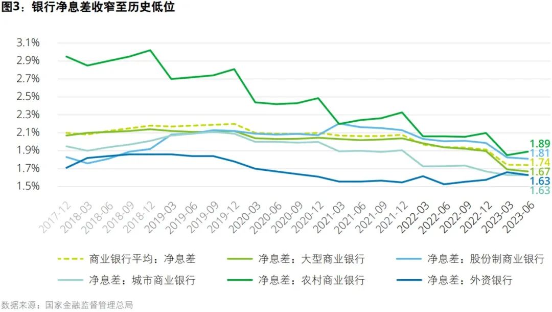 息差压力正成为银行业当前面临的首要课题。2020年以来,宽信用及贷款利率持续下行,但信贷需求转弱、价格竞争激烈,银行业净息差持续收窄,至2022年末首次跌破2%,2023年一季度进一步跌至1.74%,同比降低23个基点,低于1.8%的行业警戒线,且二季度维持不变,未见好转。