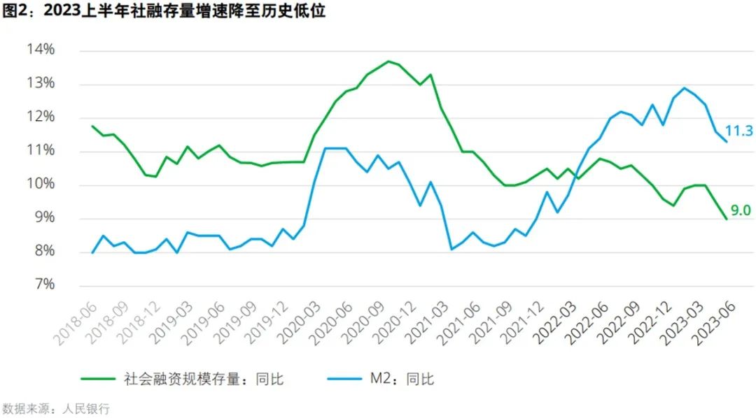 6月末,M2同比增长11.3%,增速自今年2月以来连续4个月下降;社融存量同比增长9%,创历史新低,并且7月进一步降至8.9%。自2022年4月起,“M2-社融”出现正剪刀差,且裂口持续扩大,至2023年1月达到3.2%后已回落。这表明随着经济复苏,货币宽松正逐渐回归至常态化,但内生融资需求如企业投资、居民消费/购房意愿仍然疲弱,需要进一步修复。