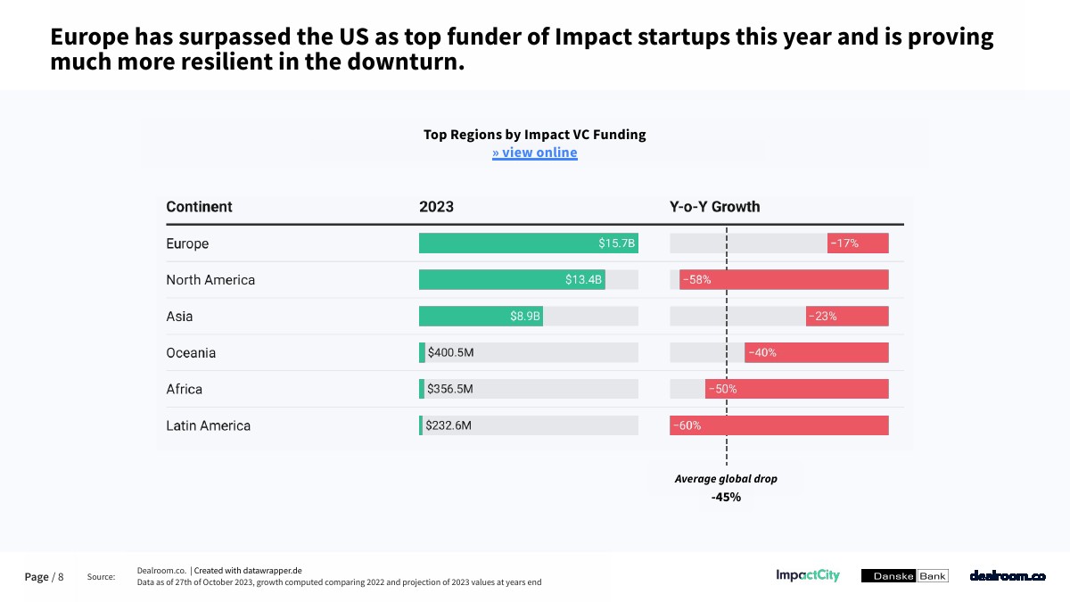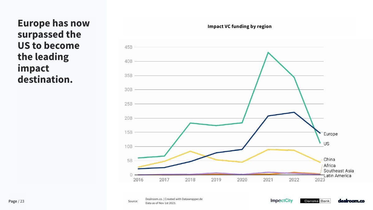 2023年,欧洲在影响力风险投资方面已经超过了美国,并继续成为迄今为止影响力投资份额最高的地区(超过30%),而美国不到10%。