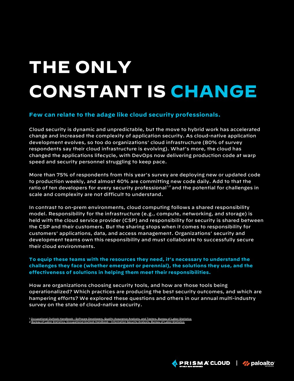 与本地环境相比,云计算遵循共享责任模型。基础设施(例如,计算、网络和存储)的责任由云服务提供商(CSP)承担,安全责任由CSP和他们的客户共同承担。但是,当涉及到对客户应用程序、数据和访问管理的责任时,共享就停止了。企业的安全和开发团队承担这一责任,必须协作才能成功地保护他们的云环境。