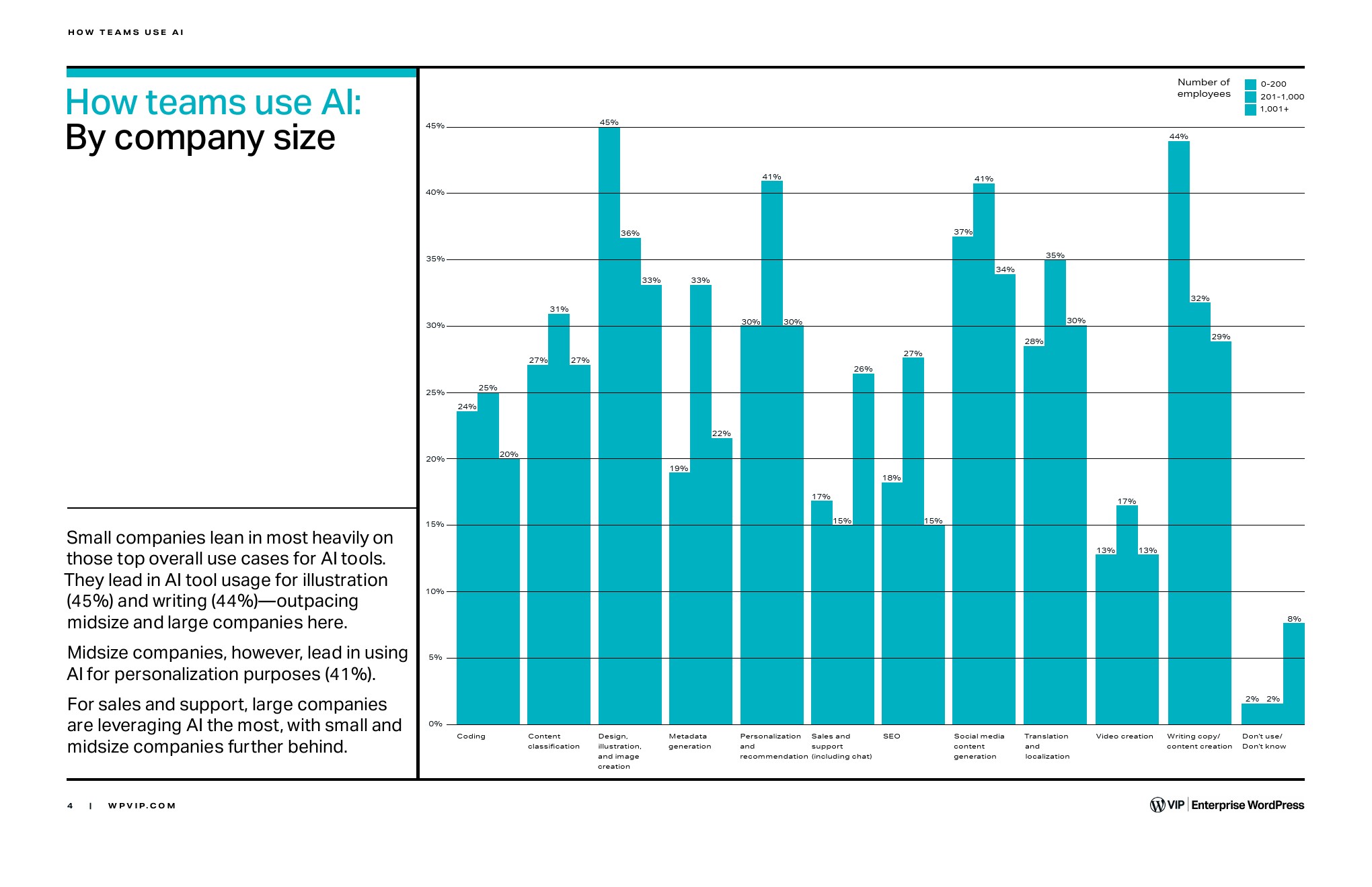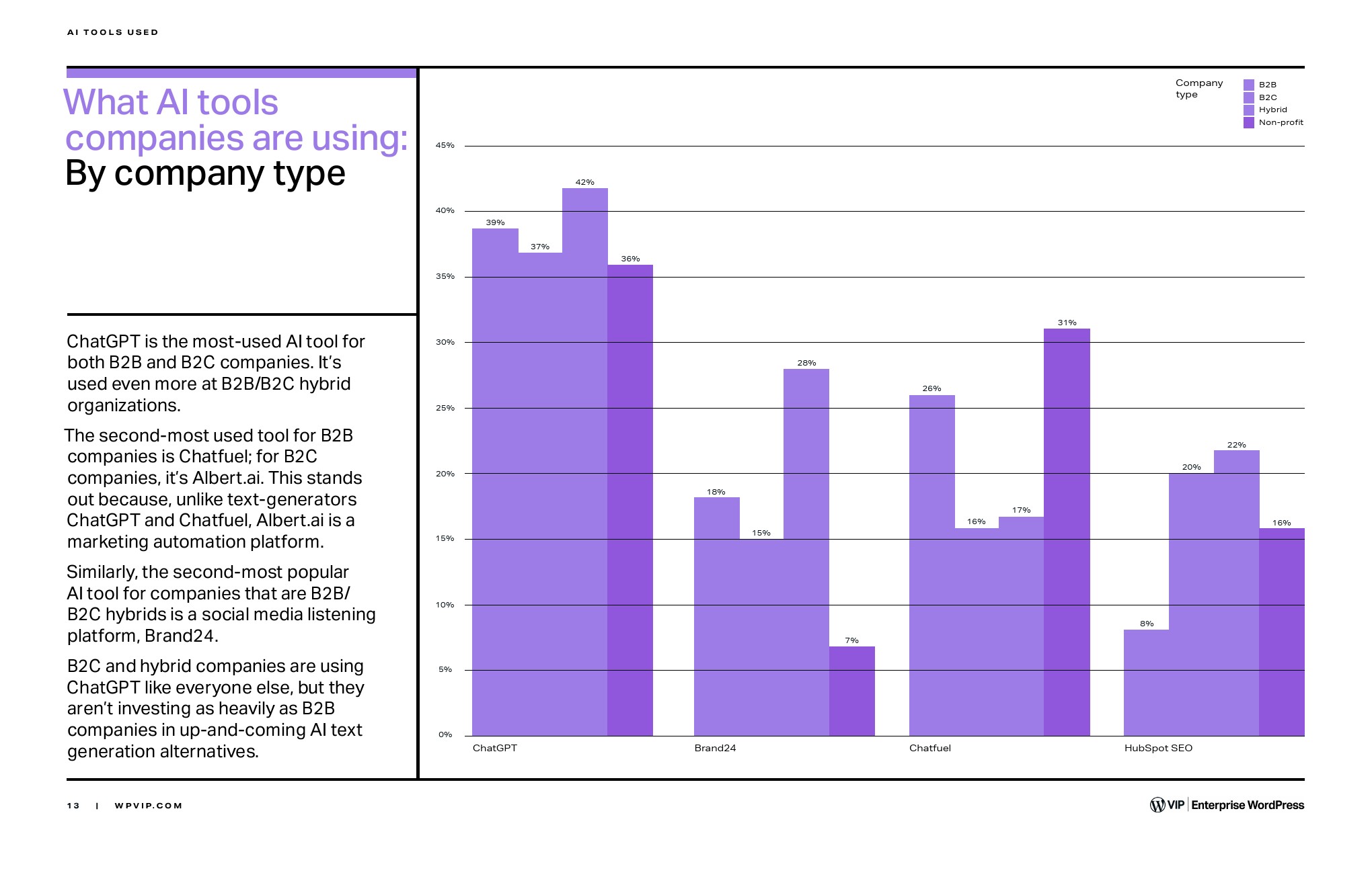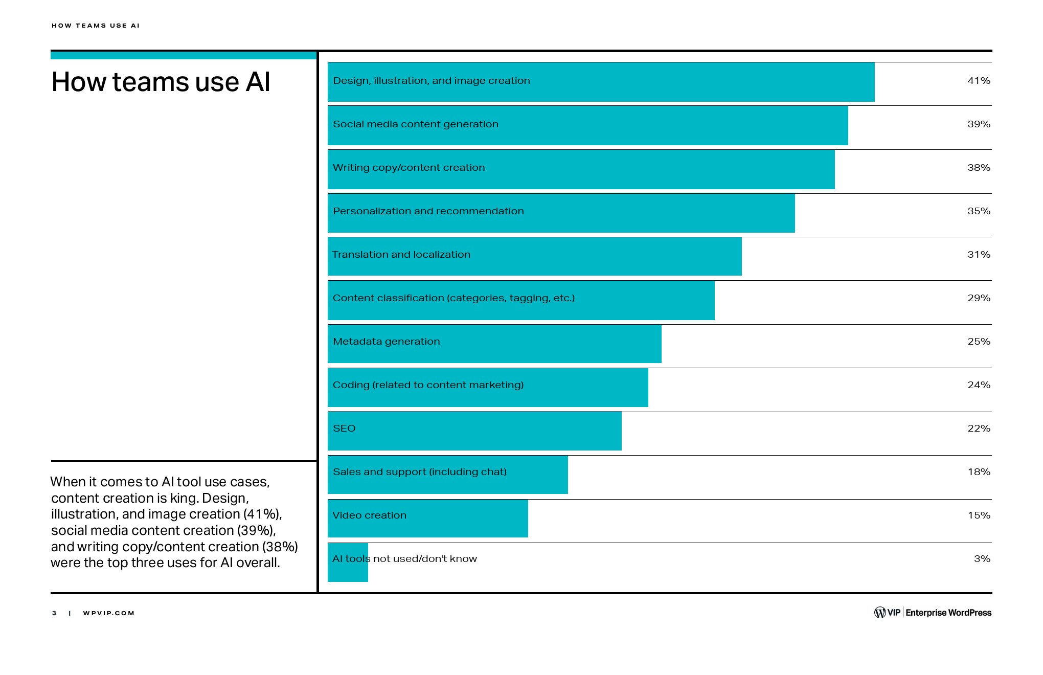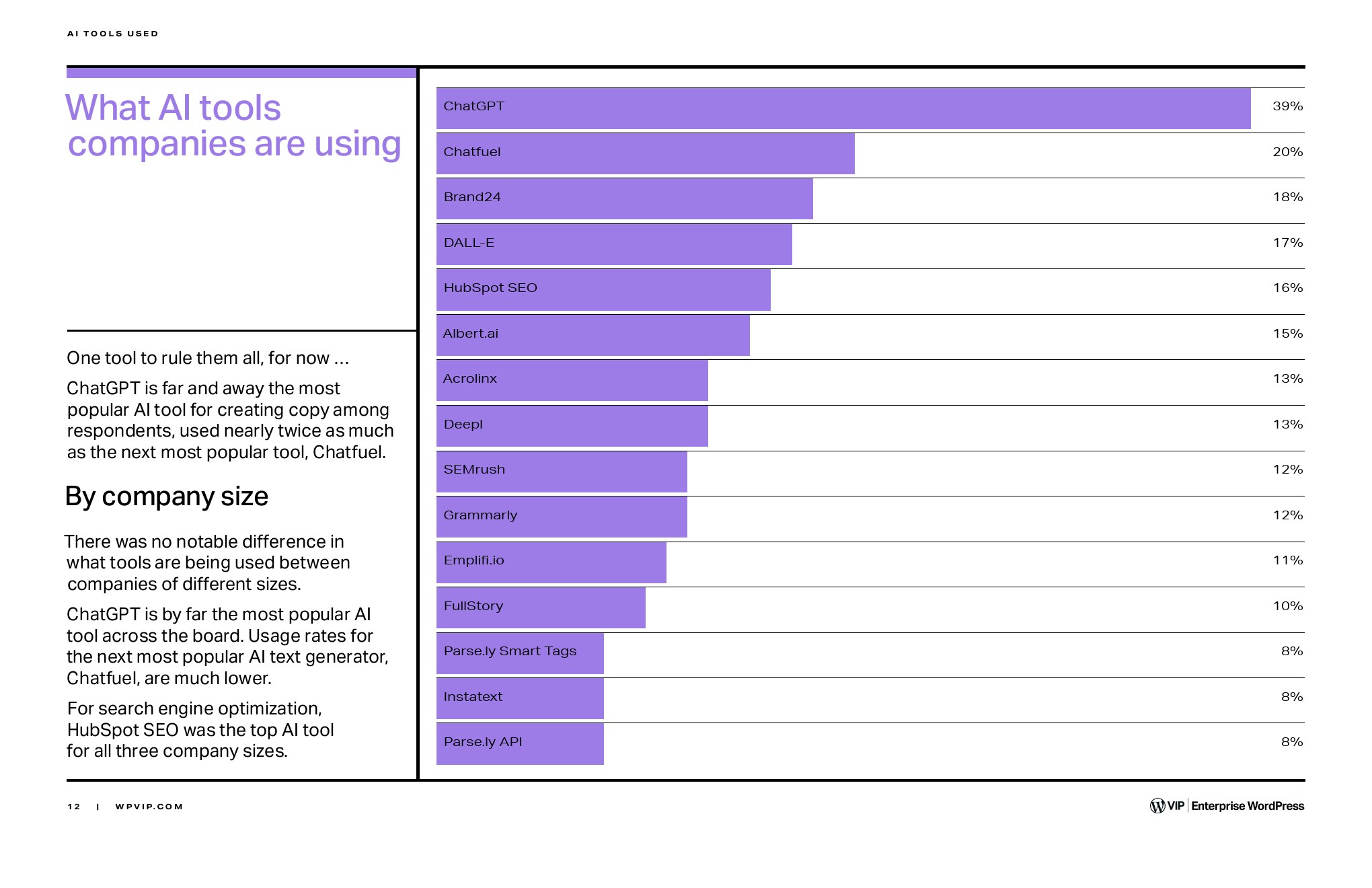 上个季度,Enterprise WordPress在其报告中揭示了生成式人工智能在营销中的应用程度。在各种规模、类型和行业的公司中,人工智能工具正受到热烈欢迎,使用量也在不断增长,尤其是在内容创作方面。