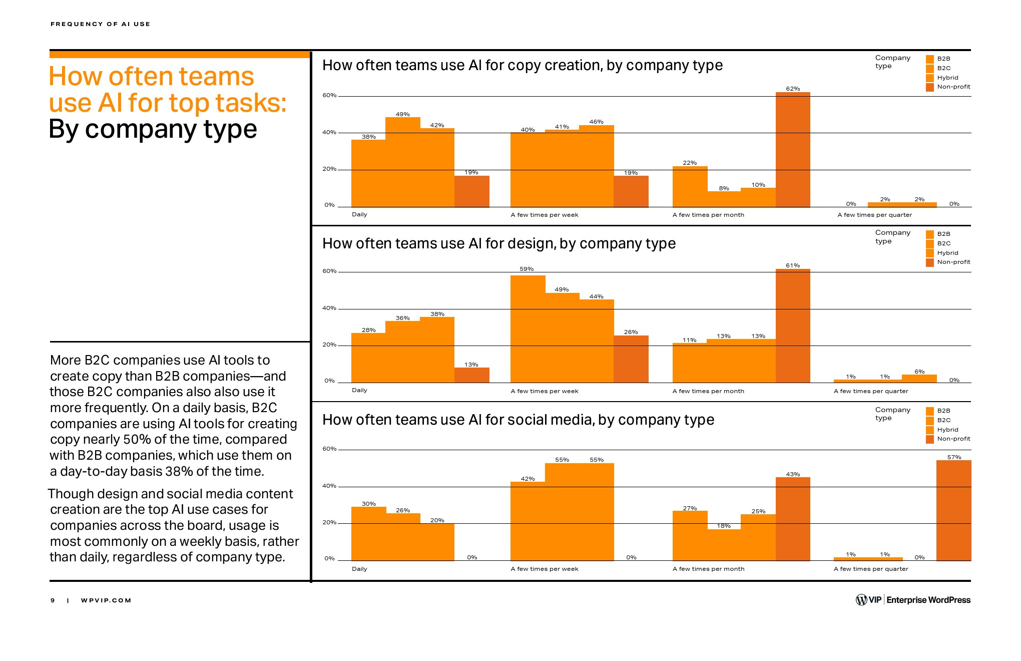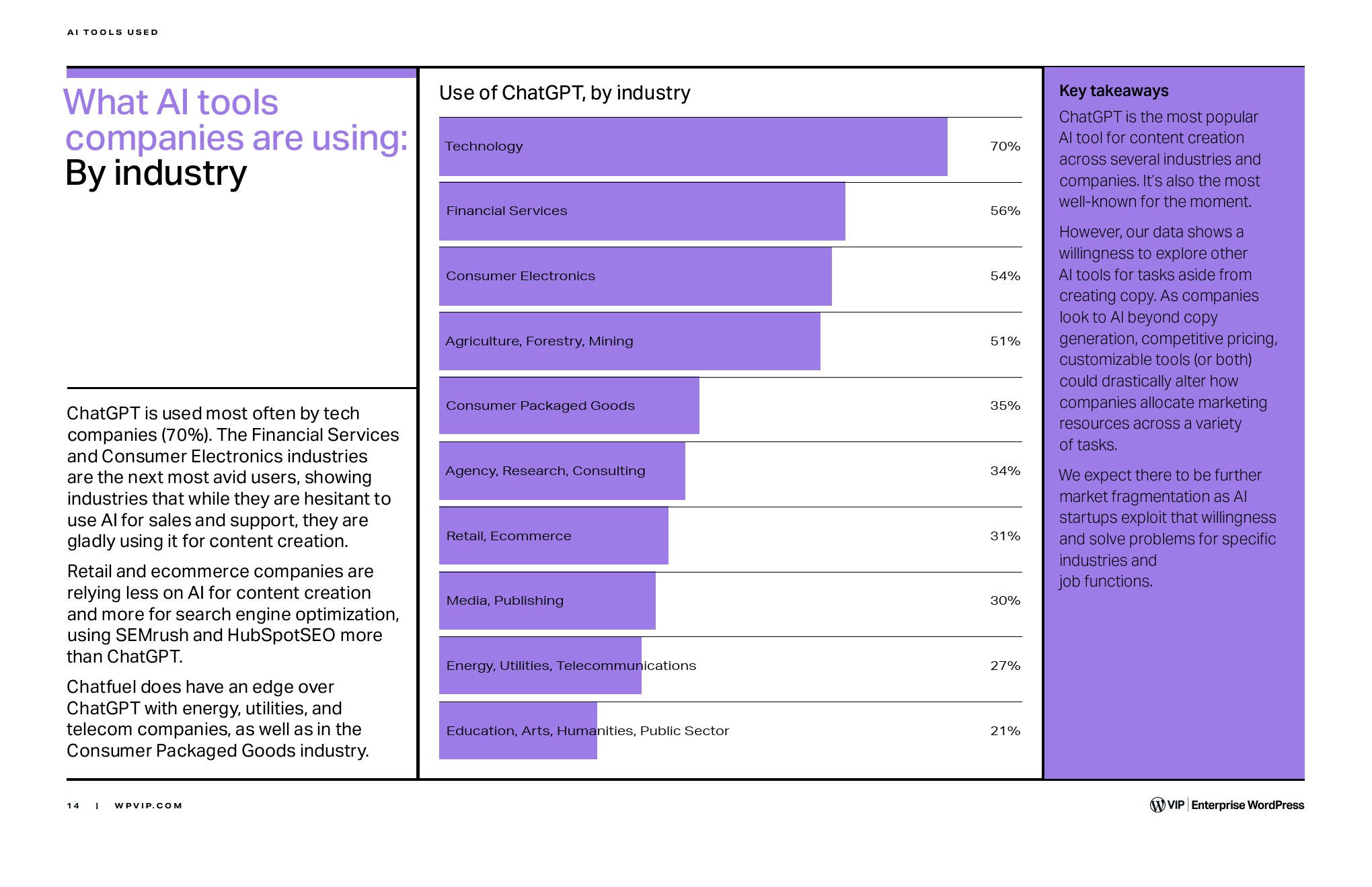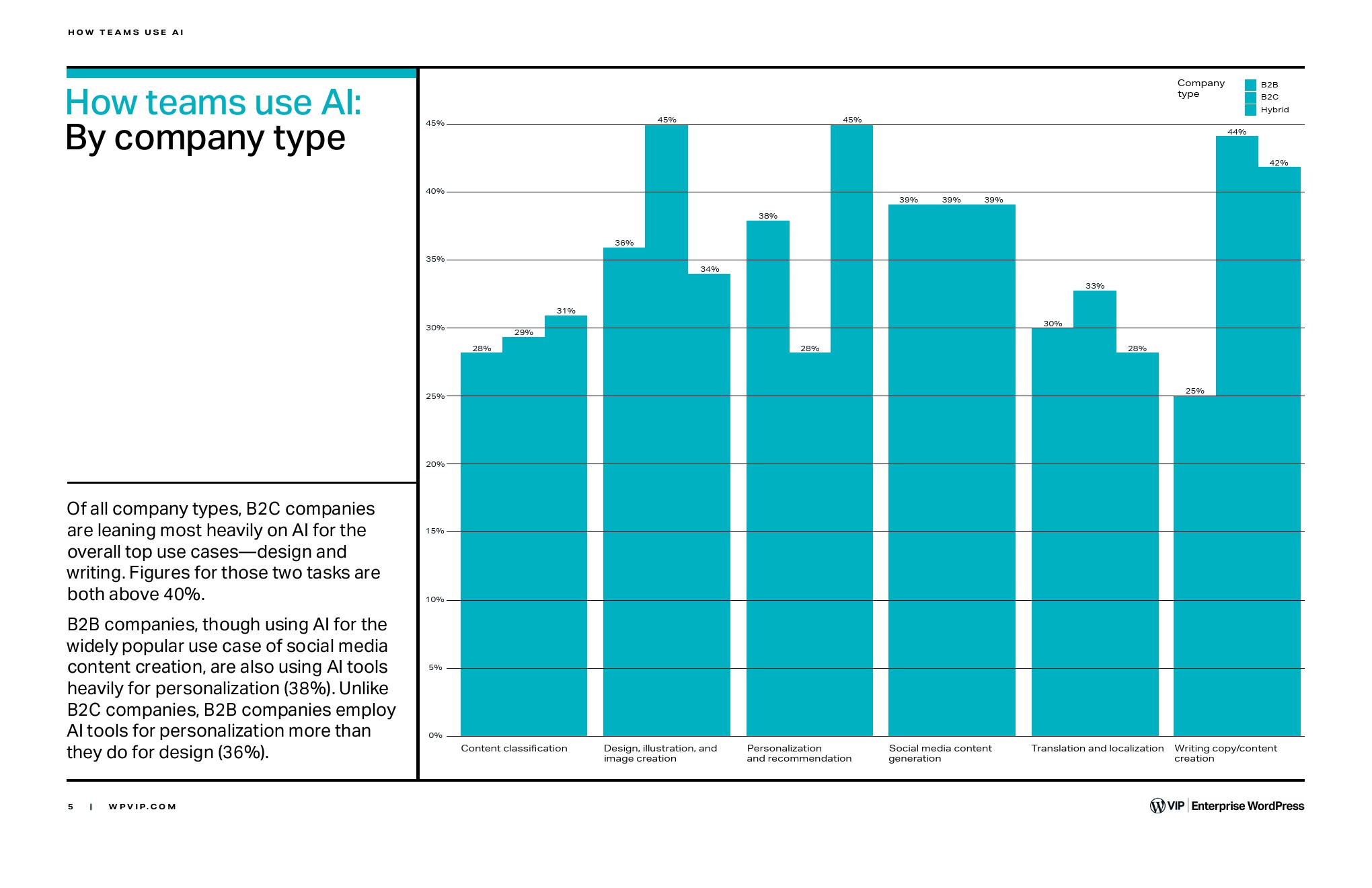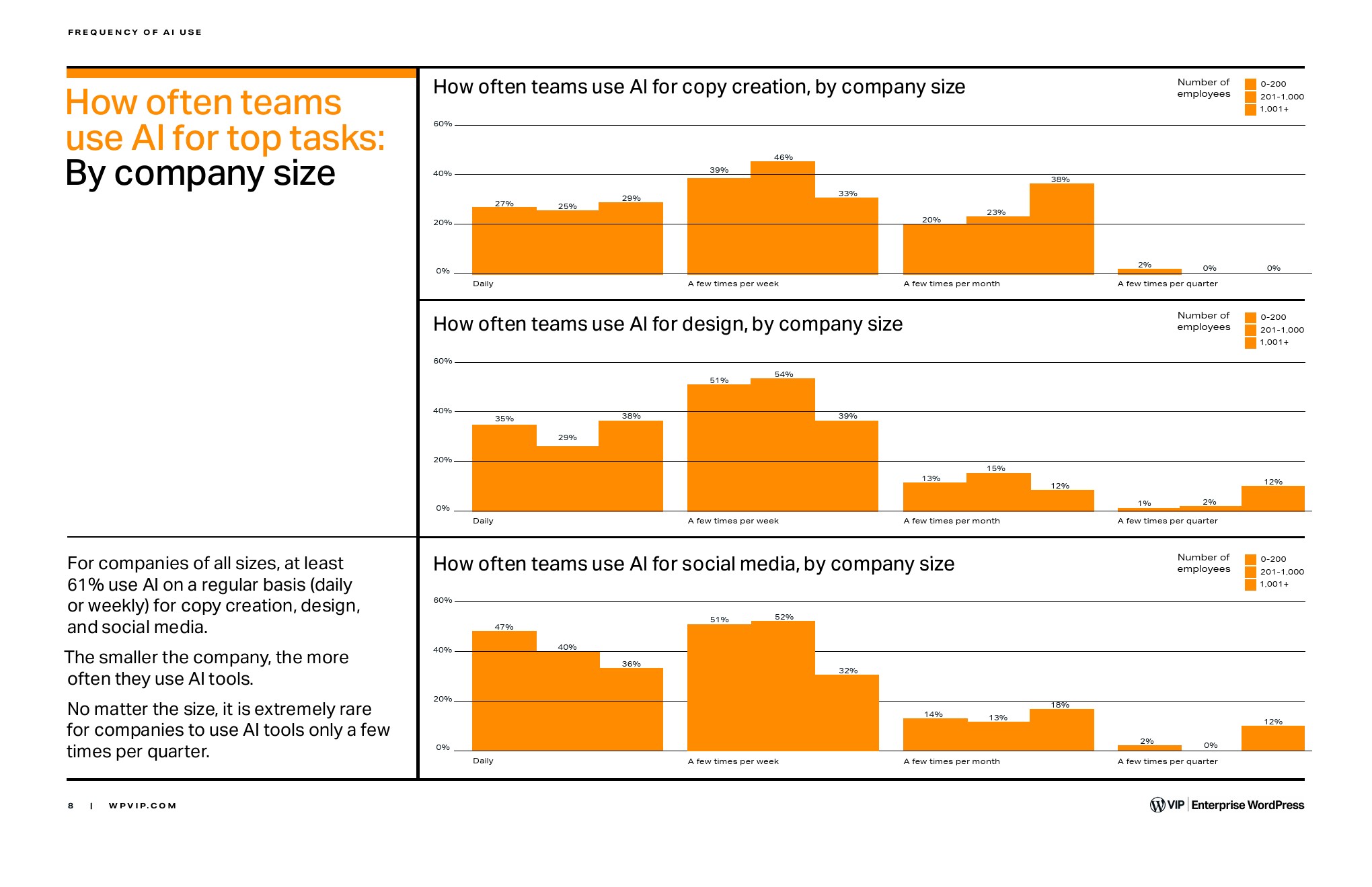 上个季度,Enterprise WordPress在其报告中揭示了生成式人工智能在营销中的应用程度。在各种规模、类型和行业的公司中,人工智能工具正受到热烈欢迎,使用量也在不断增长,尤其是在内容创作方面。