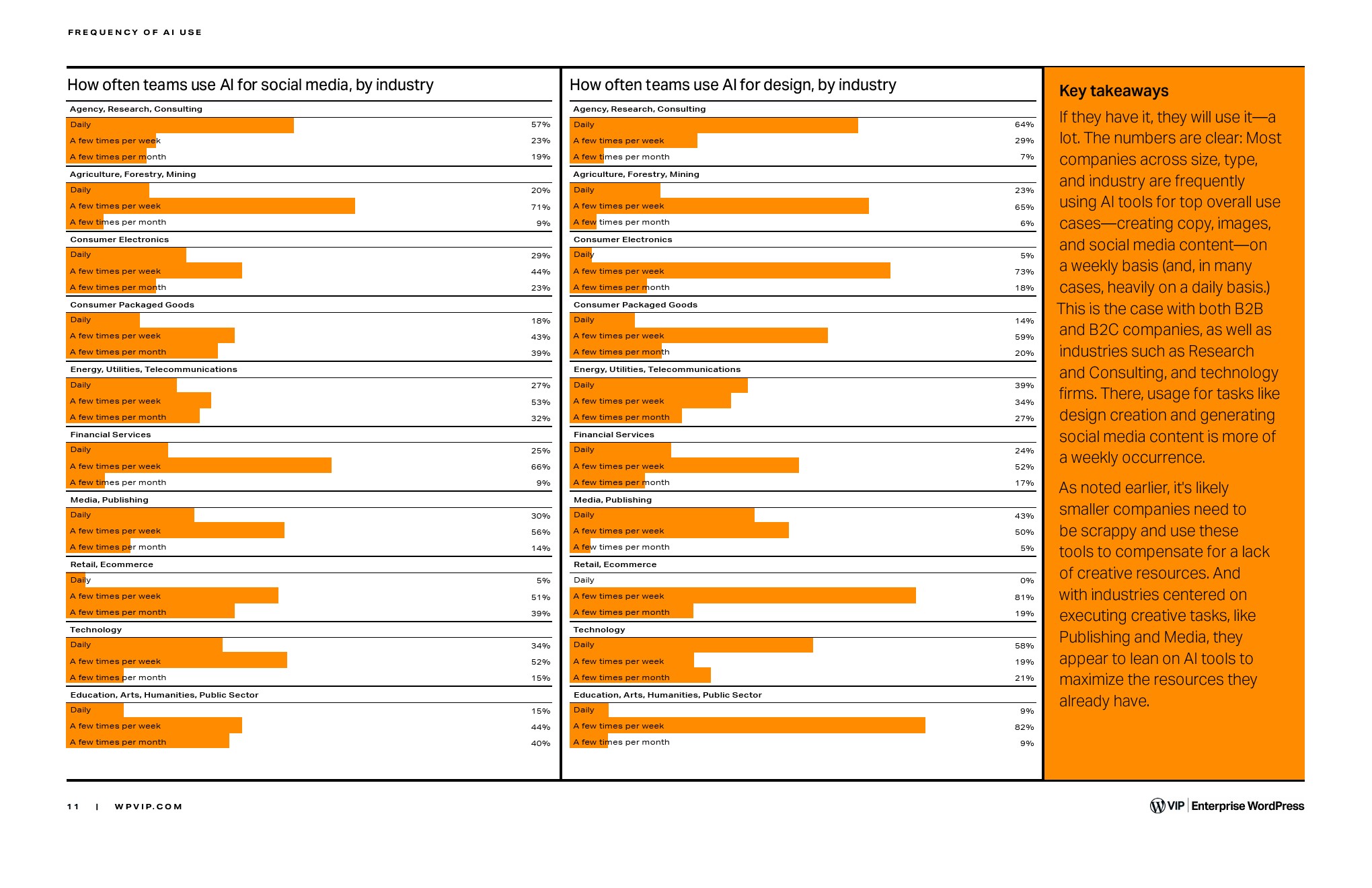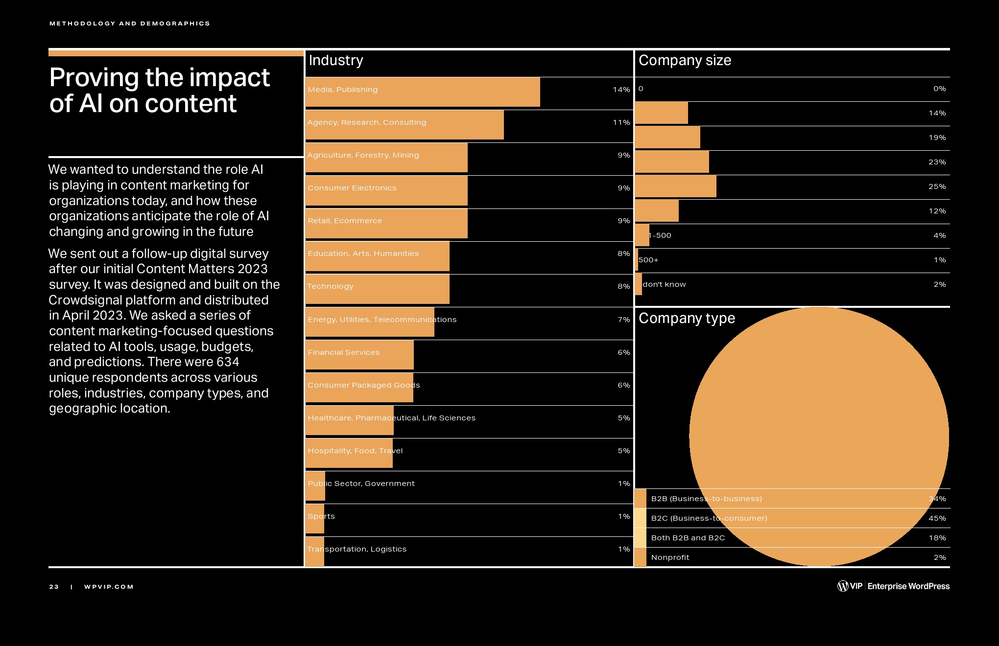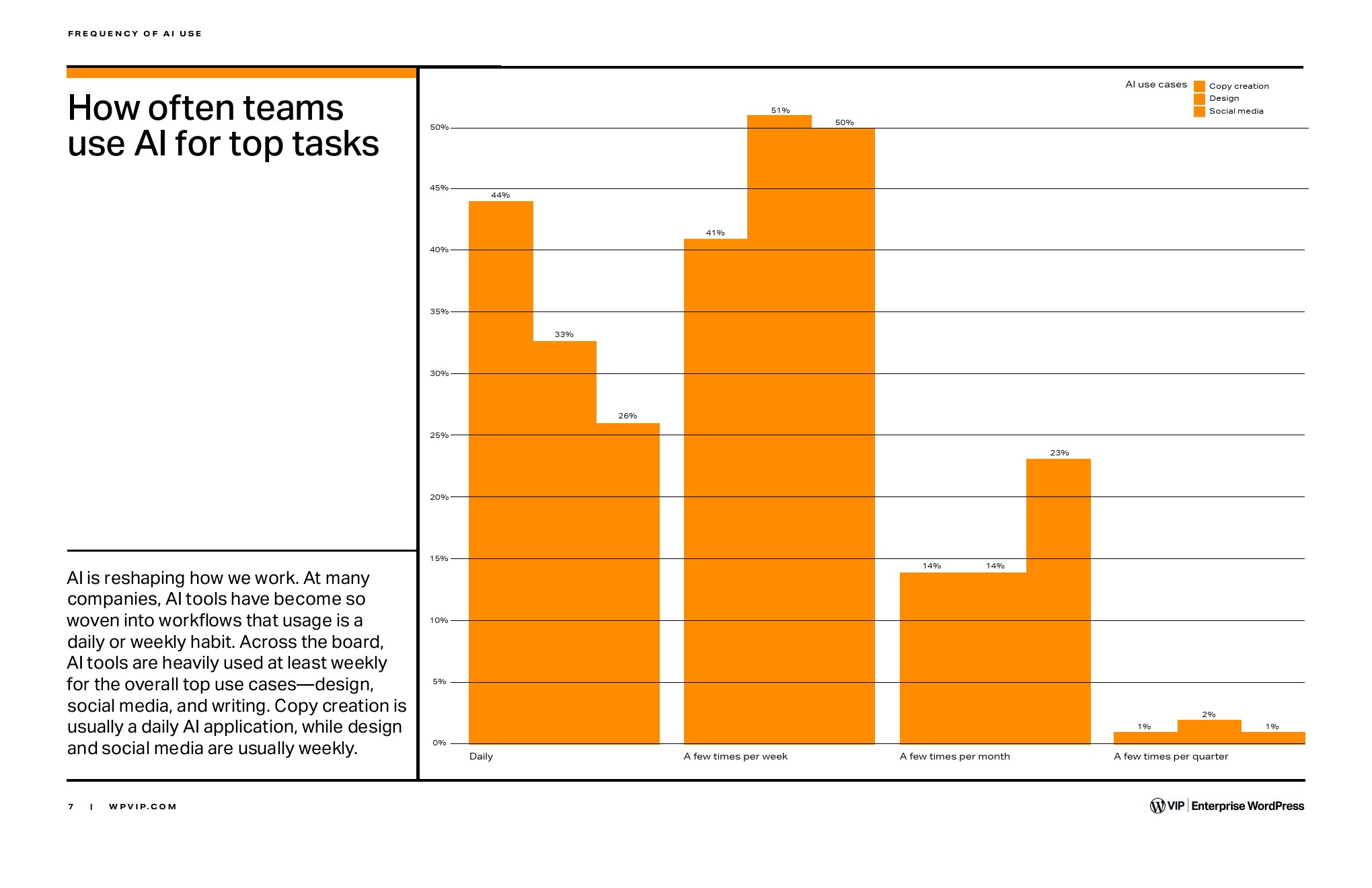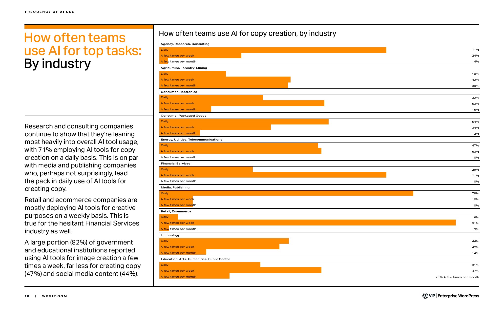 上个季度,Enterprise WordPress在其报告中揭示了生成式人工智能在营销中的应用程度。在各种规模、类型和行业的公司中,人工智能工具正受到热烈欢迎,使用量也在不断增长,尤其是在内容创作方面。