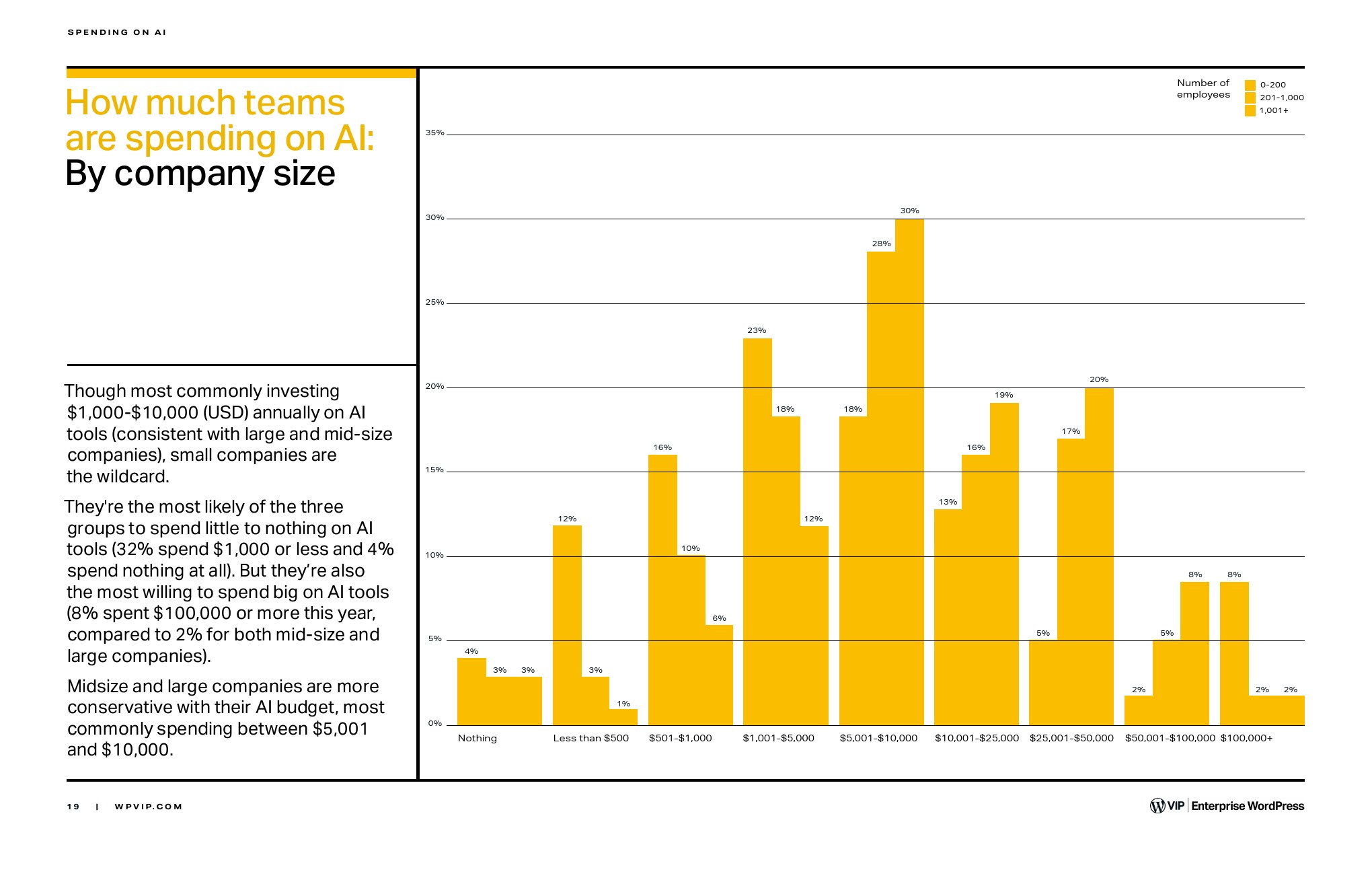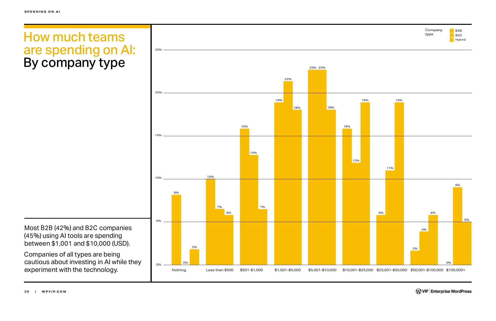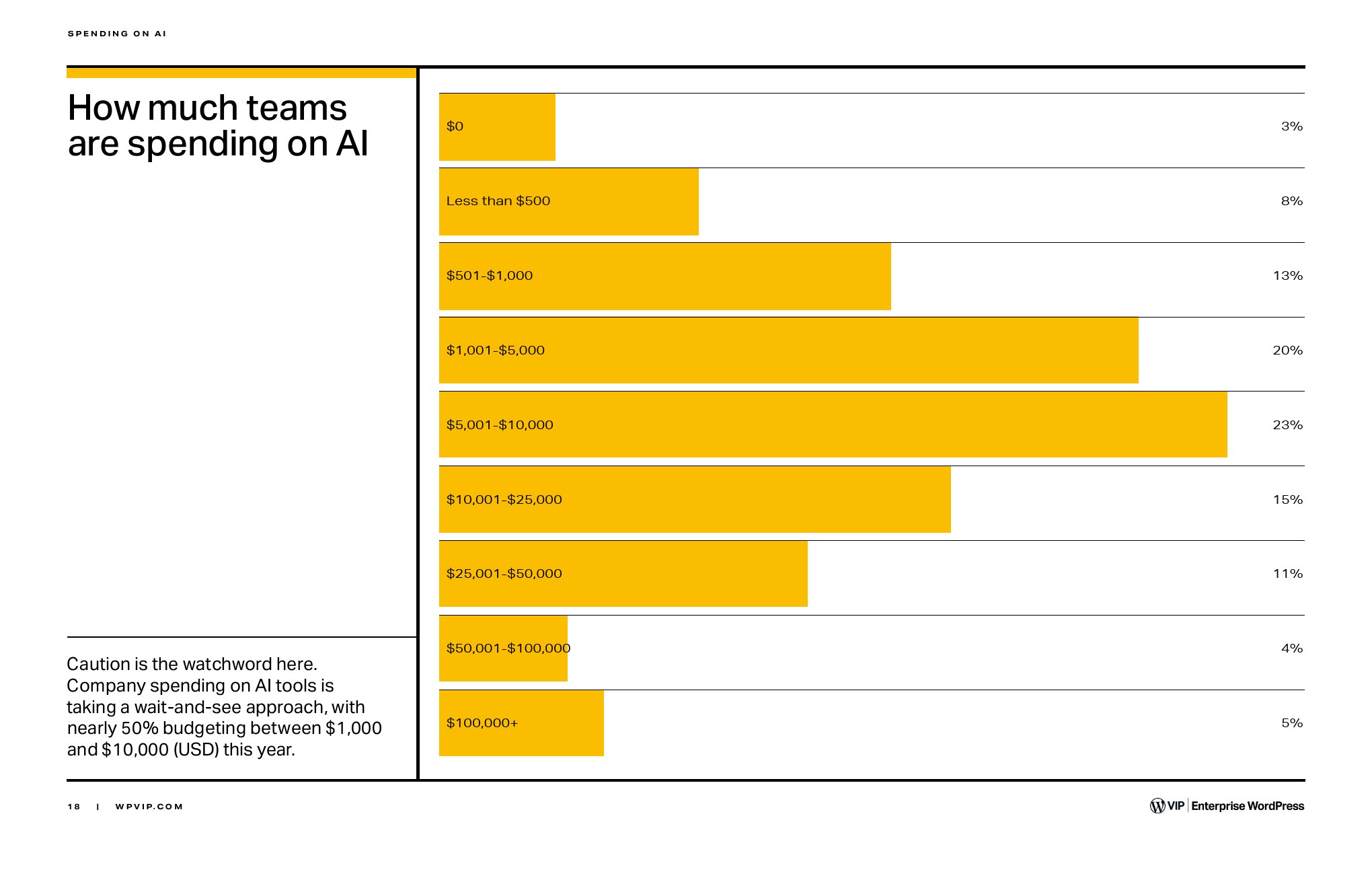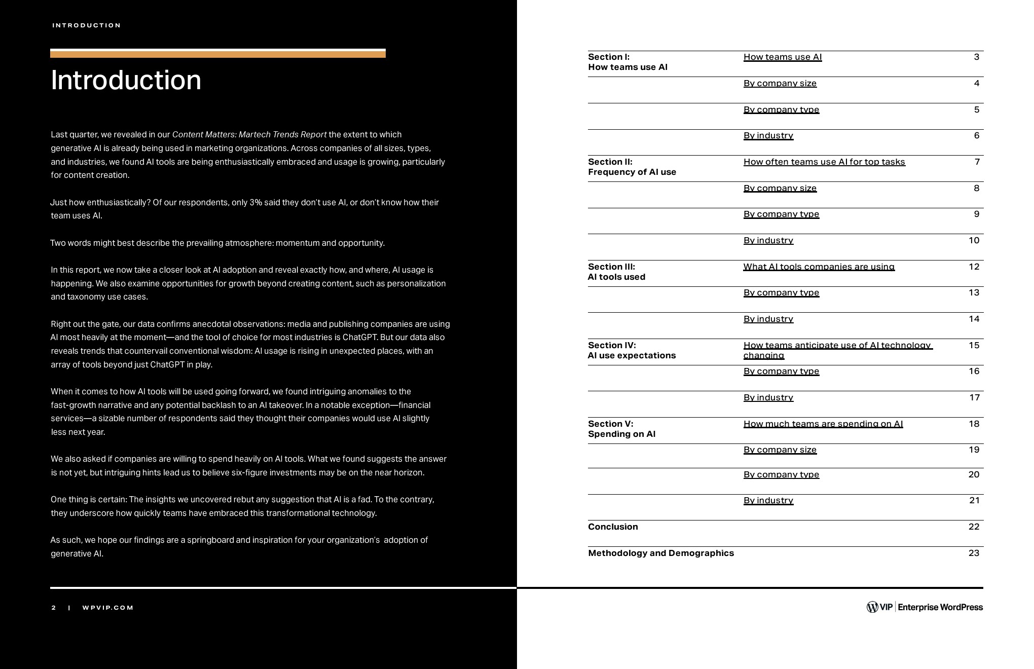 上个季度,Enterprise WordPress在其报告中揭示了生成式人工智能在营销中的应用程度。在各种规模、类型和行业的公司中,人工智能工具正受到热烈欢迎,使用量也在不断增长,尤其是在内容创作方面。