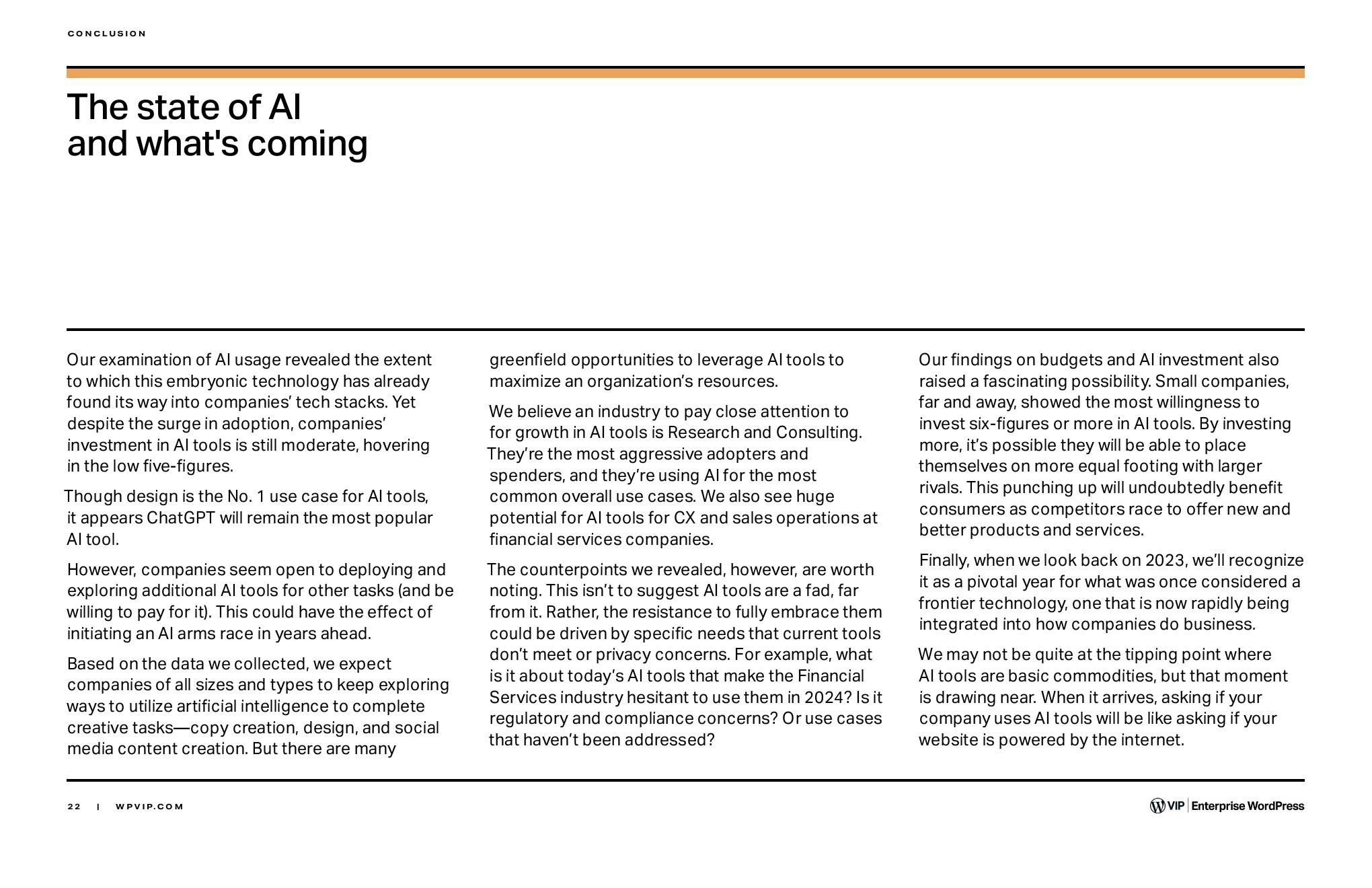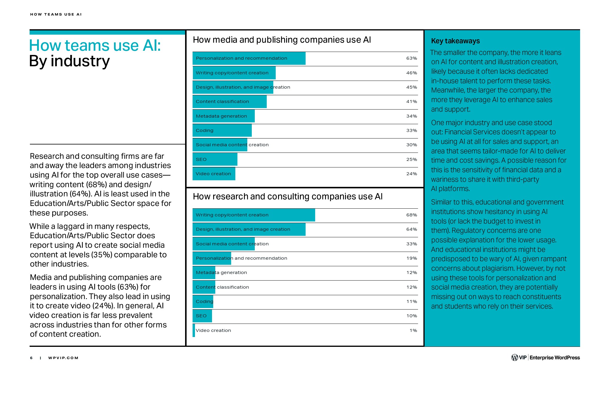 在本报告中,Enterprise WordPress仔细研究了人工智能的采用情况,并揭示人工智能的使用方式和地点。还研究了创建内容之外的增长机会,例如个性化和分类法用例。