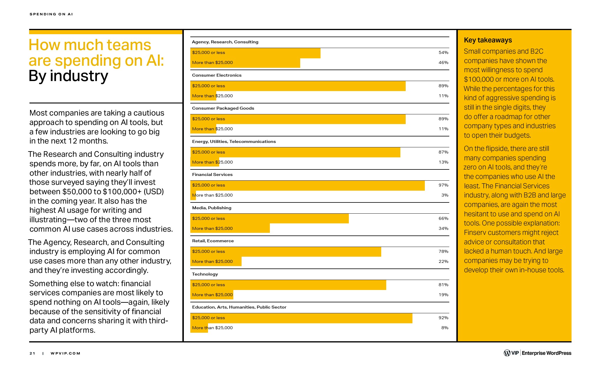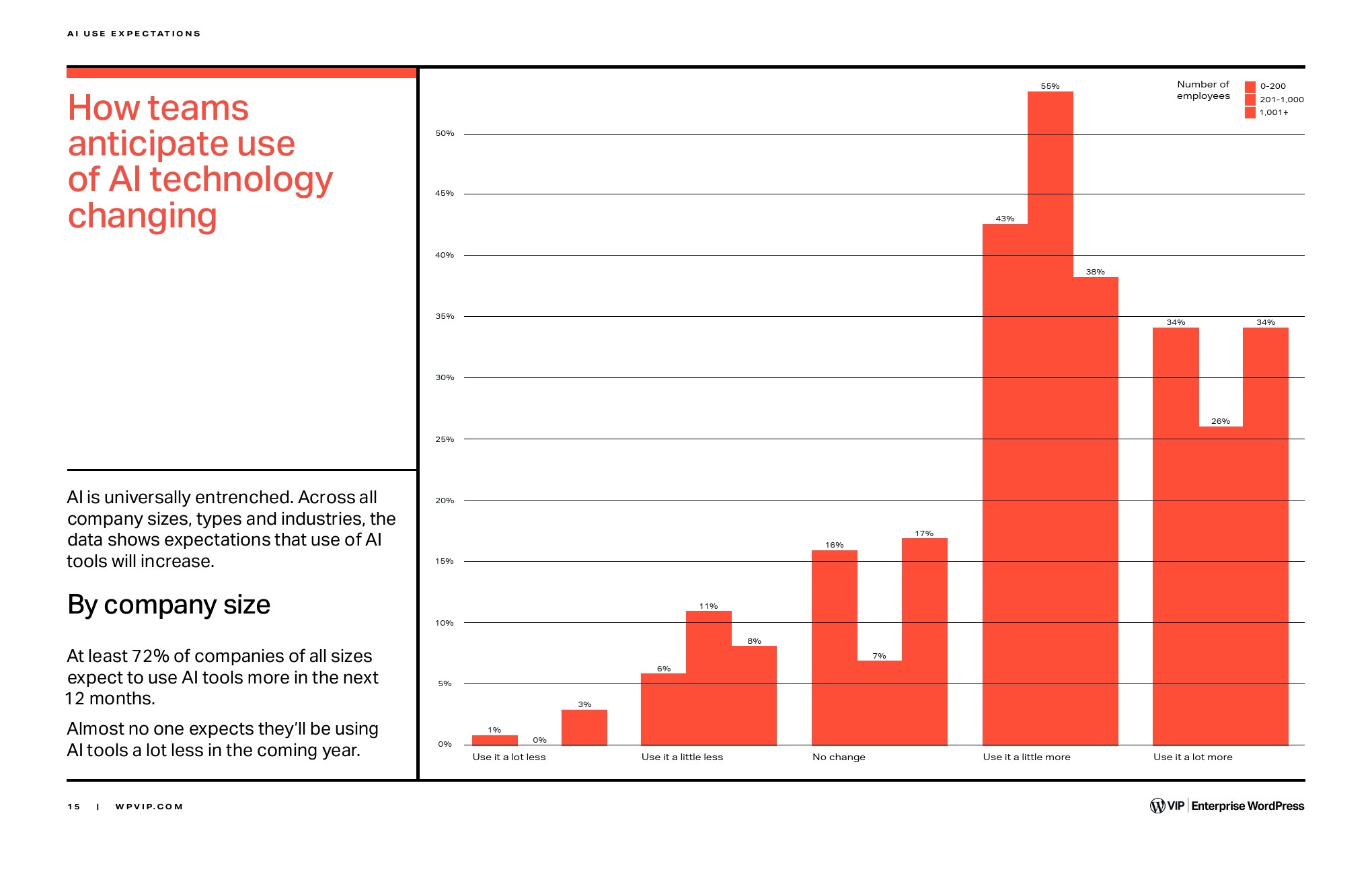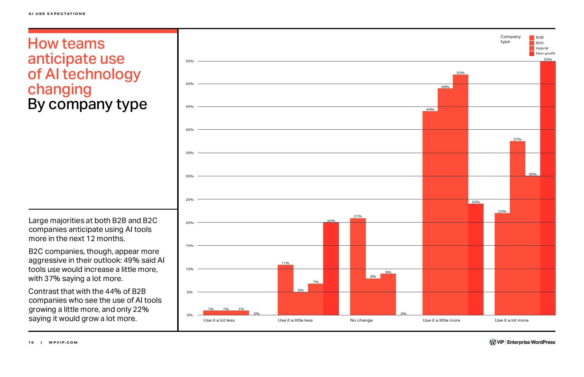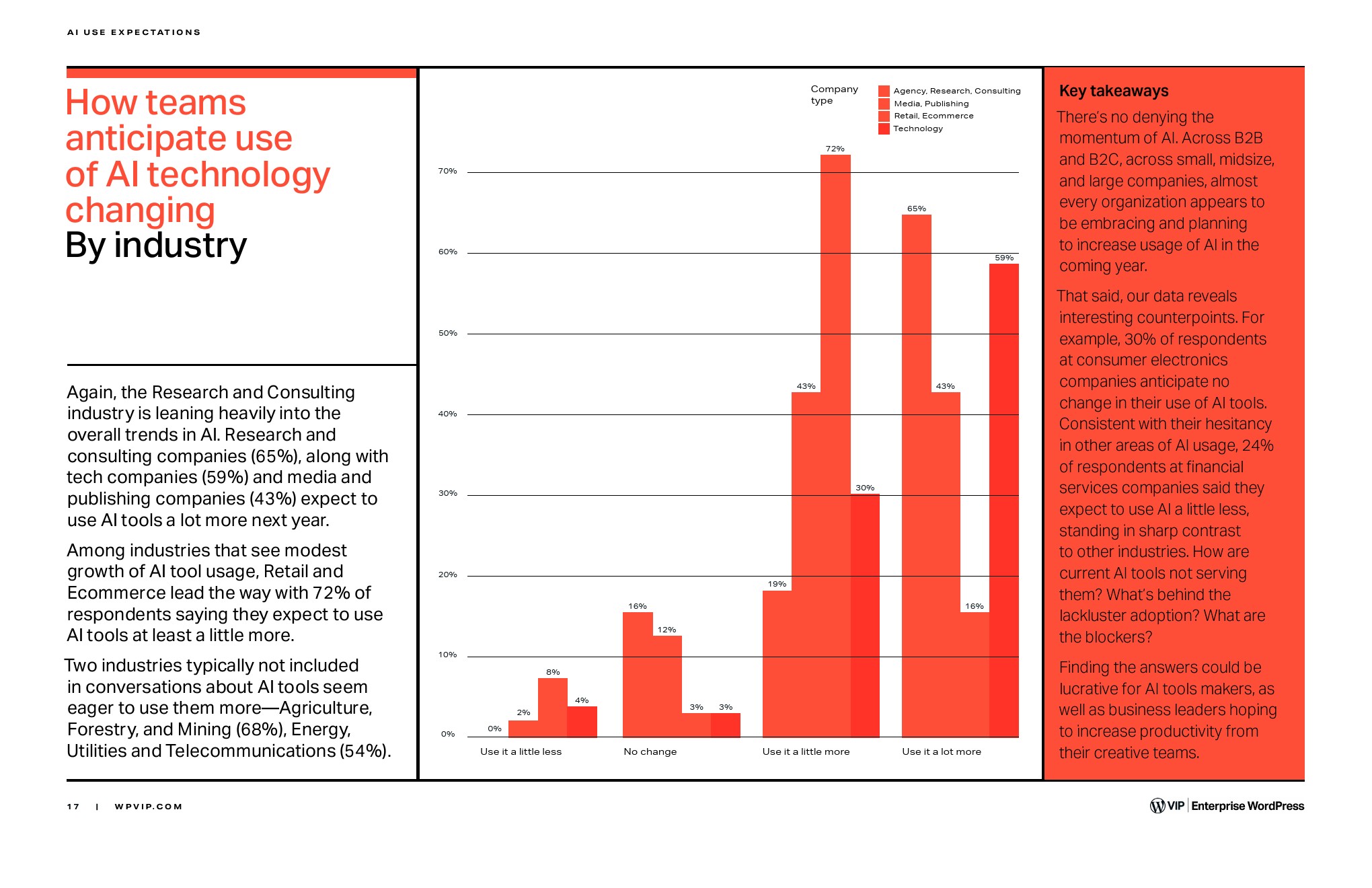 当谈到人工智能工具未来将如何使用时,Enterprise WordPress发现了一些有趣的异常现象,这些异常现象与快速增长的叙述以及对人工智能收购的潜在反弹不同。有一个明显的例外(金融服务业),相当多的受访者表示,他们公司明年将略微减少对人工智能的使用。