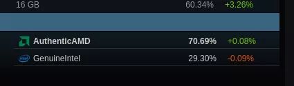 Steam 上的 Linux 玩家主要使用 AMD CPU,市场份额为 70%,而英特尔 CPU 的市场份额仅为 30%。