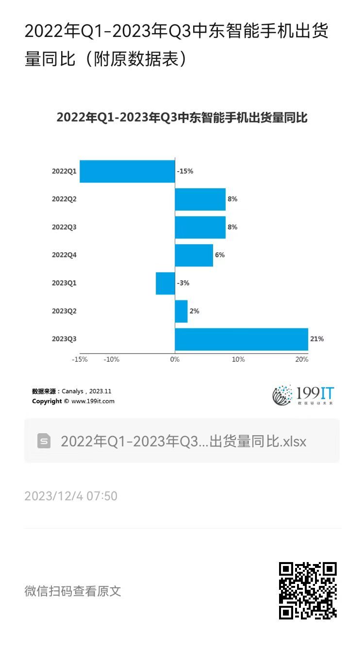 - 2021年Q1-2023年Q1中东智能手机出货量同比(附原数据表)