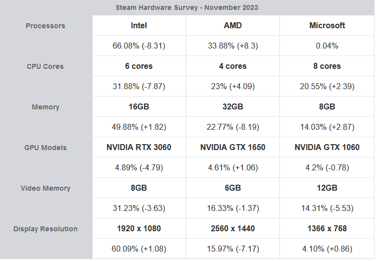 2023 年 12 月将是我们在 Valve 的报告中看到 Windows 7、Windows 8 和 Windows 8.1 的最后一个月。该公司将于 2024 年 1 月 1 日停止该平台的支持。尽管超过 99% 的 Steam 用户使用的是受支持的 Windows 版本,但仍有人在使用 Windows 7 和 Windows 8 的系统上玩游戏。64 位 Windows 7 占 0.69%(-0.38),64 位 Windows 8.1 占 0.16(+0.03),32 位 Windows 7 占 0.06%(+0.06)。