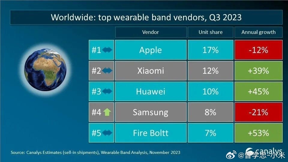 根据市场调研机构Canalys的最新数据,小米可穿戴在2023年Q3市场中以12%的份额稳居全球第二。这个成绩仅次于苹果的17%份额,但小米目前依然在猛速上升中,而苹果却已经开始大幅回落。
