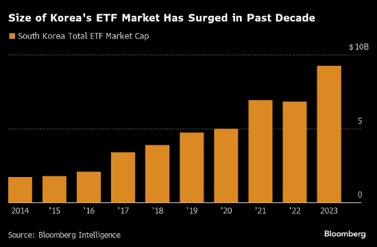“简单、普通是没劲的,他们想要两到三倍的杠杆 —— 至少在某些板块里,”彭博行业研究驻香港股票策略师Rebecca Sin说。她说,ETF在韩国人气飙升,得益于广泛的产品范围以及社交媒体 —— 很多网红会宣扬投资此类产品的优点。