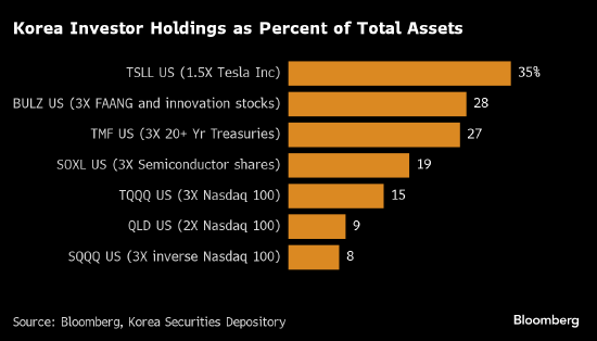 韩国散户投资者钟爱杠杆交易所交易基金(ETF),以至于他们在一些美国上市知名杠杆ETF的持股比例达到了20%以上。数据显示,他们最青睐的一只ETF将特斯拉押注放大了1.5倍,另一只则三倍押注FAANG等科技股 —— 他们分别持有这两只ETF不少于35%和28%的份额。