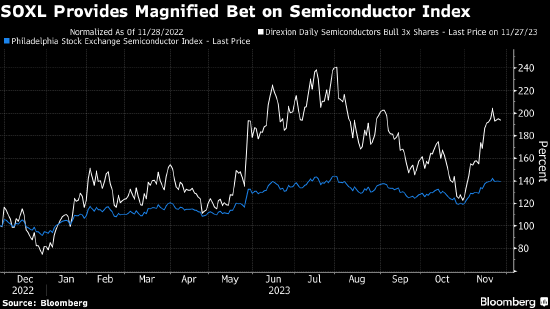 受欢迎程度位居第三的,是一只追踪美国上市芯片股的三倍杠杆ETF(交易代码SOXL),而且今年已飙升近140%。