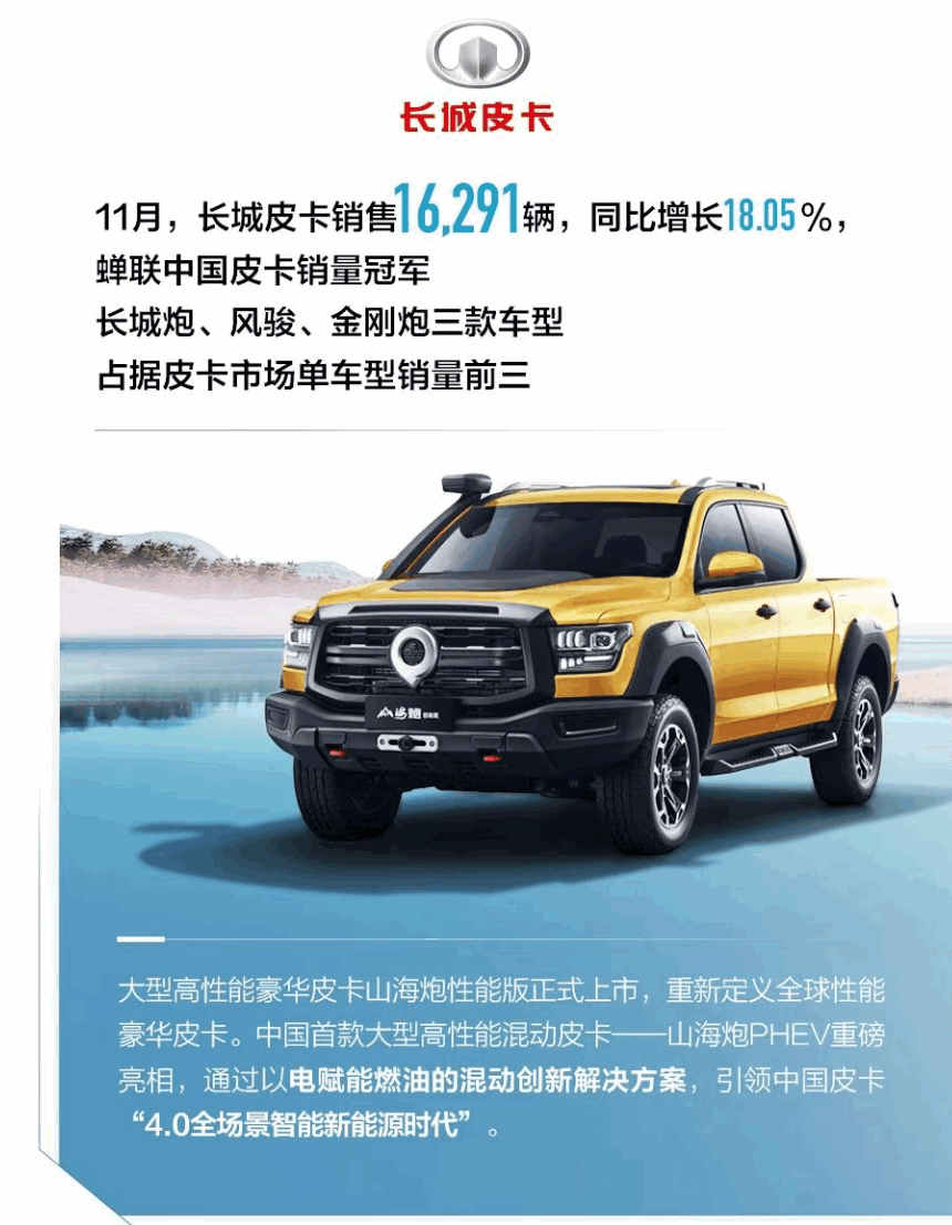 皮卡阵营中,长城已是国内绝对的王者,长城皮卡11月销售16291辆,同比增长18.05%,蝉联中国皮卡销量冠军。