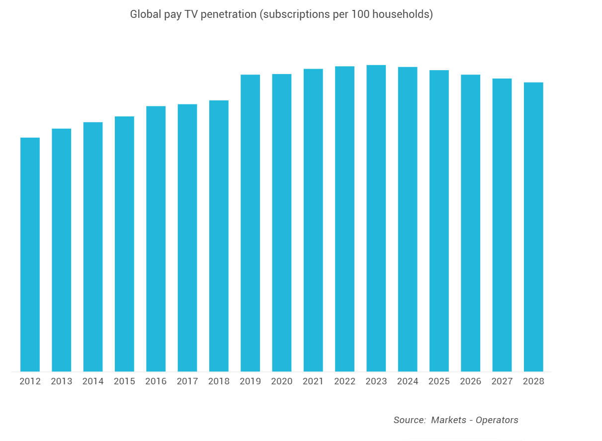 全球付费电视渗透率(付费电视订阅数量相对于家庭数量)将在2024年出现有史以来的首次下降,此前预计2023年第四季度的峰值渗透率为60.3%。根据Ampere覆盖96个市场的最新预测,到2028年底将下降近4个百分点。