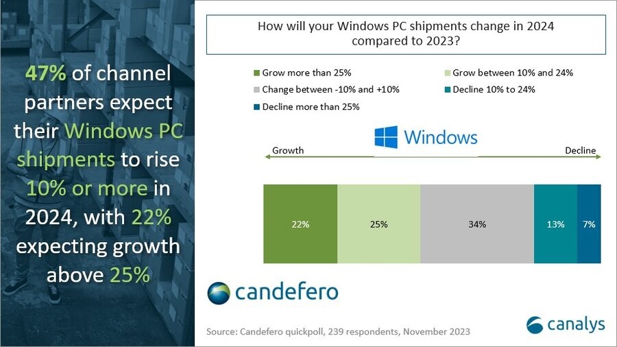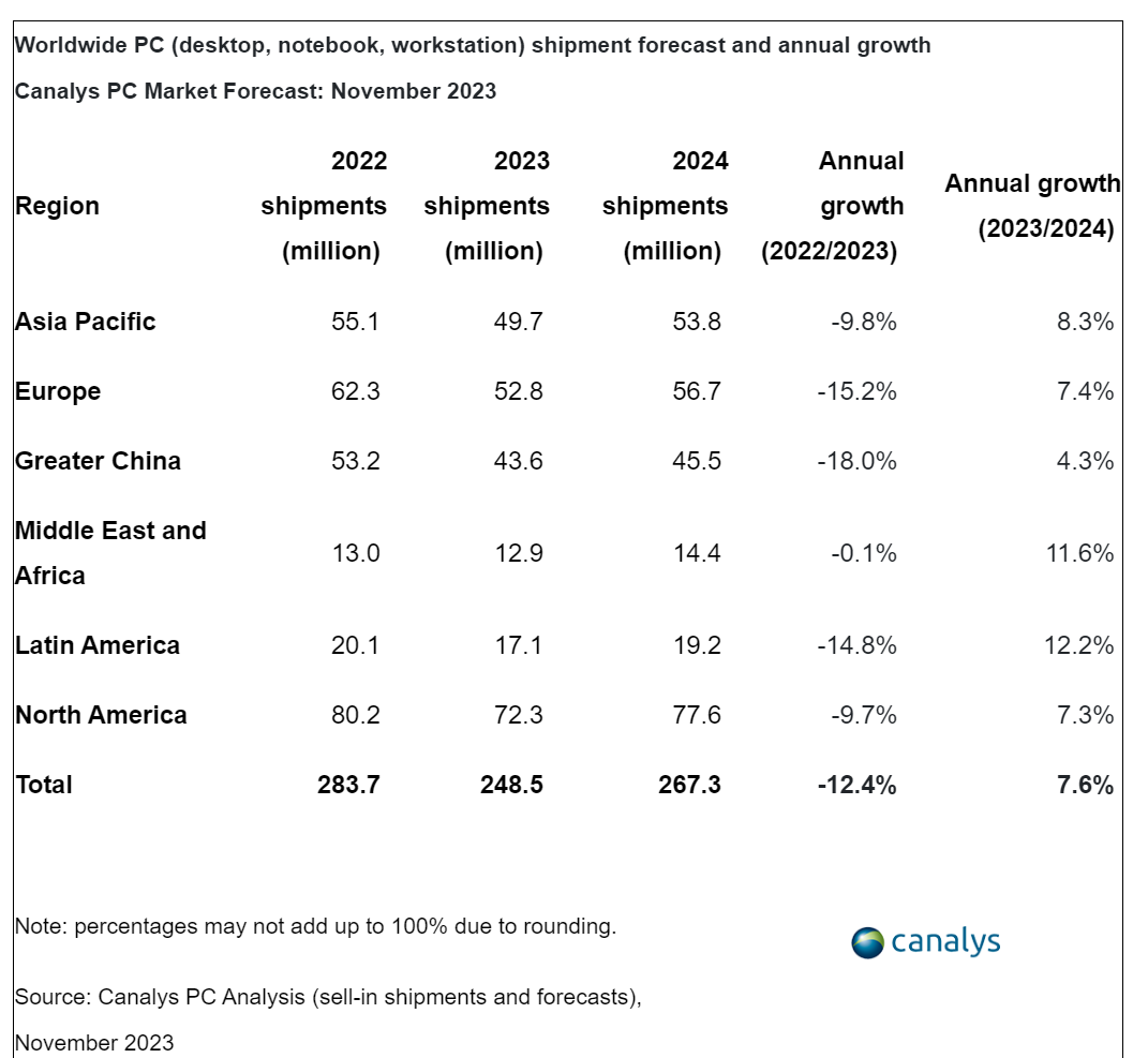 根据Canalys的最新预测,全球个人电脑出货量在连续7个季度下滑后即将复苏。受假日旺季和宏观经济环境改善的推动,预计2023年第四季度市场将恢复5%的增长率。展望未来,预计2024年全年出货量将达到2.67亿台,比2023年增长8%,这得益于Windows更新周期以及支持人工智能和基于ARM的设备的出现。