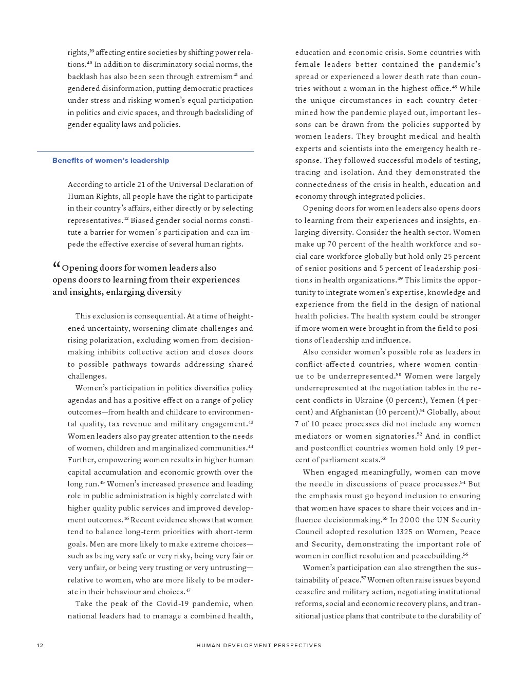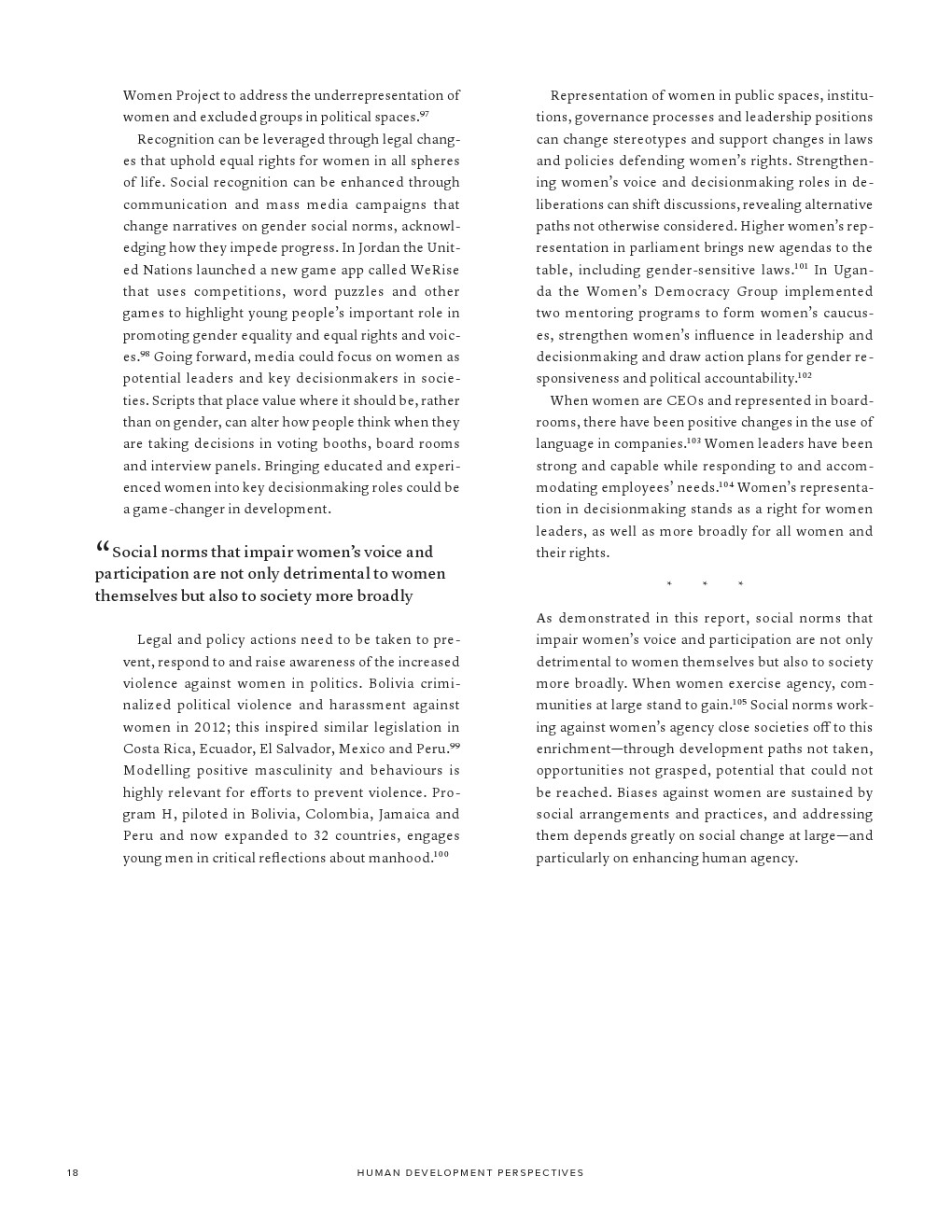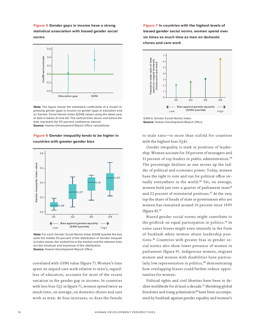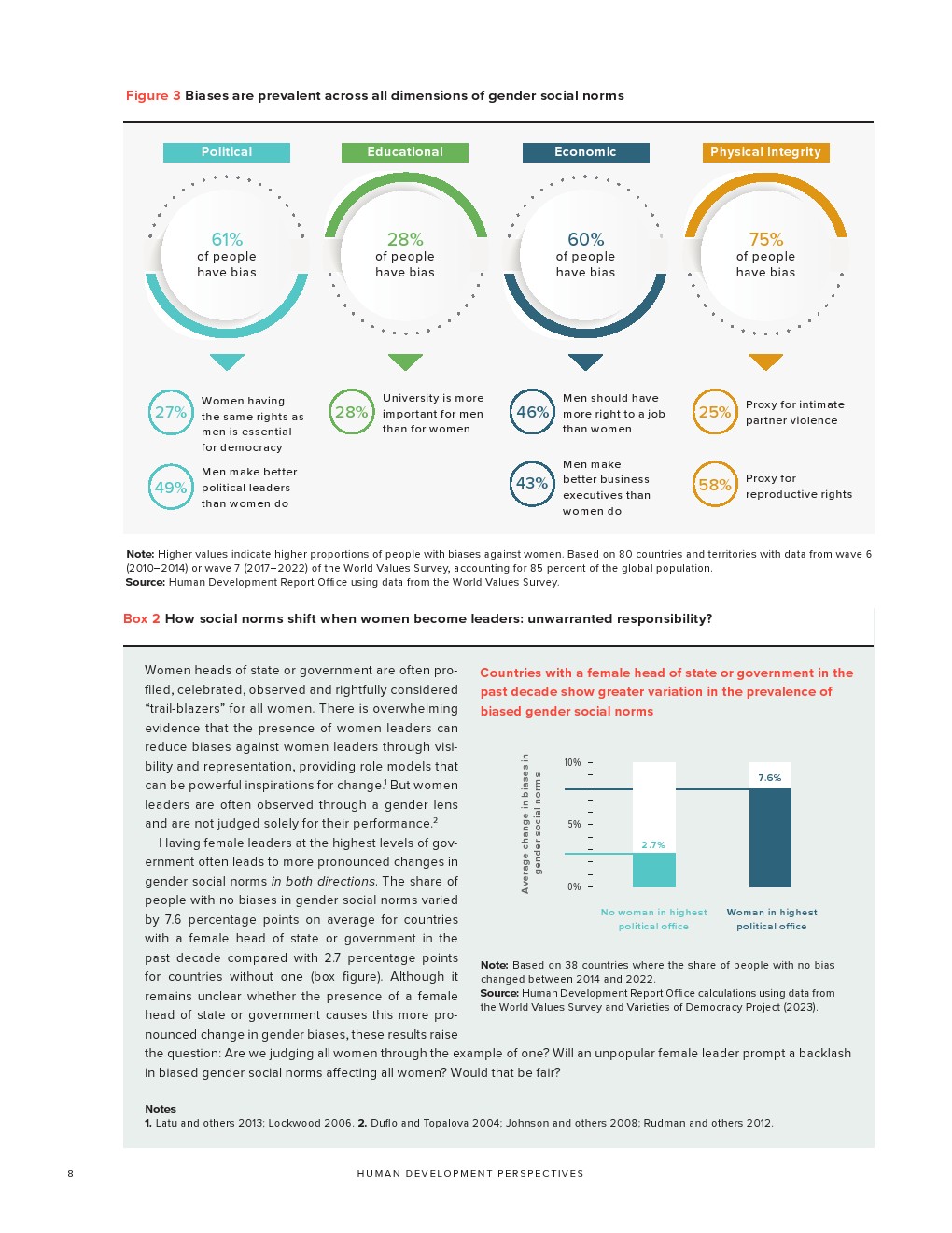 有偏见的性别社会规范还阻碍了女性成为领导者。尽管大多数国家已经消除了妇女担任政治职务的许多正式障碍,但政治代表性方面的性别差距仍然很大。自1995年以来,女性在全球国家元首或政府首脑中所占的比例平均保持在10%左右,女性在全球议会席位中所占比例略高于1/4,女性领导者往往比男性同行受到更严厉的评判。