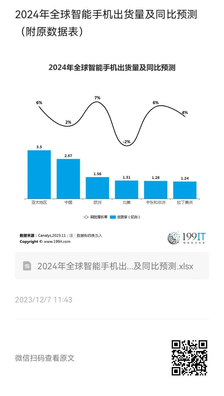 2024年全球智能手机出货量及同比预测(附原数据表) ​​​