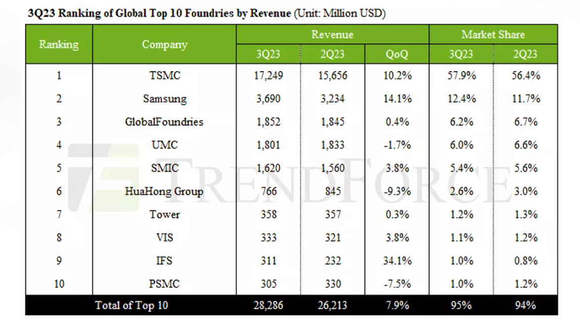 TrendForce 指出,随着台积电、三星、中芯国际和 IFS 取得积极业绩,全球晶圆代工行业目前正处于上升轨道。预计 2023 年第四季度将确认该行业的健康状态,对采用尖端和更”微不足道”的芯片生产节点制造的智能手机组件的需求将不断增加。