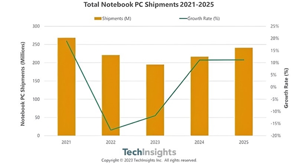TechInsights透露预计2024年全球笔记本出货量将比2023年增长11%,这主要得益于人工智能开始进入主流市场,以及消费者升级焕新周期。