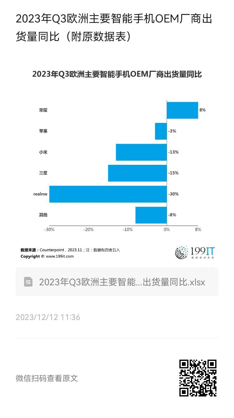 - 2023年Q3全球主要智能手机OEM厂商出货量同比(附原数据表)