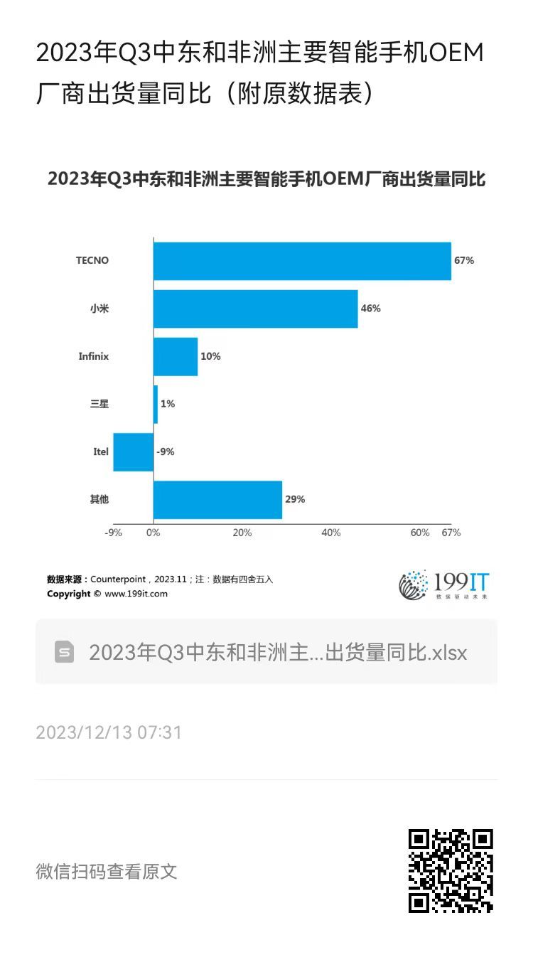 - 2023年Q3中东和非洲主要智能手机OEM厂商出货量份额(附原数据表)