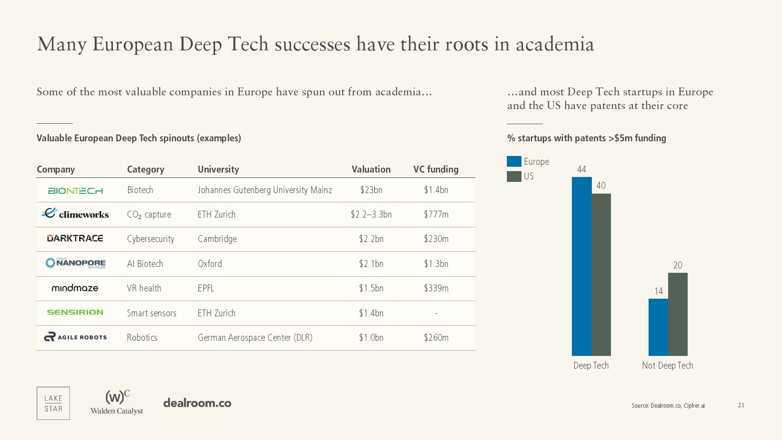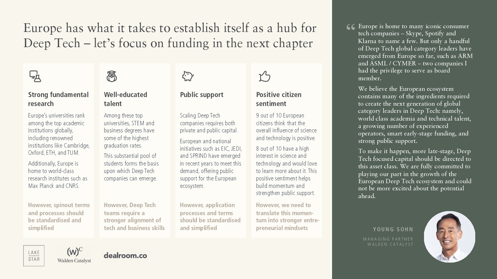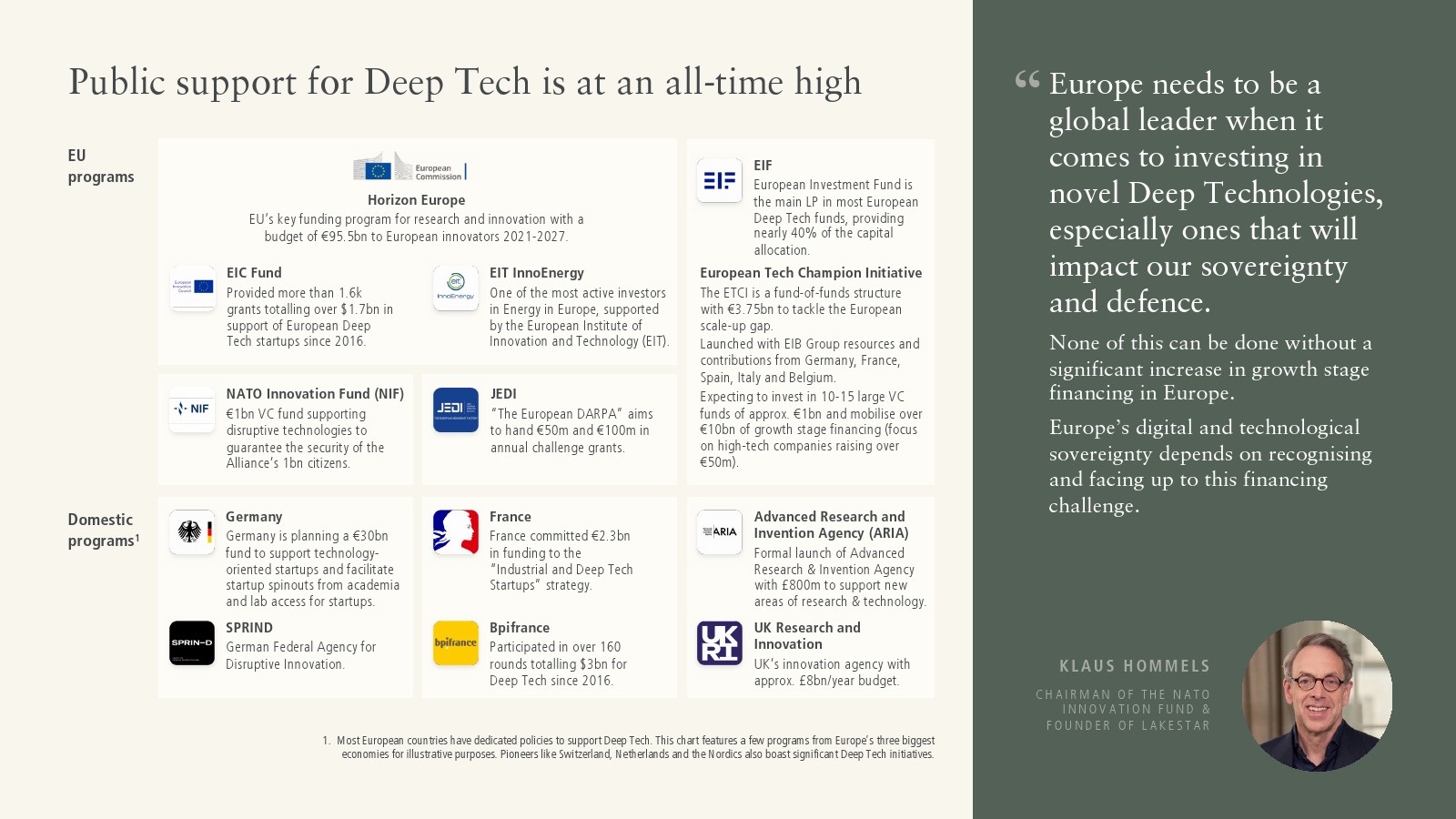 欧洲仍然面临的一些最大挑战,如鼓励更多的企业家进入深度科技,协调大学衍生条款,形成更密集的人才/卓越集群,提高有限合伙人基础和机构投资者的参与,强调政府和企业作为客户的重要性,加强投资退出渠道,以及促进创始人和投资者的多样性。